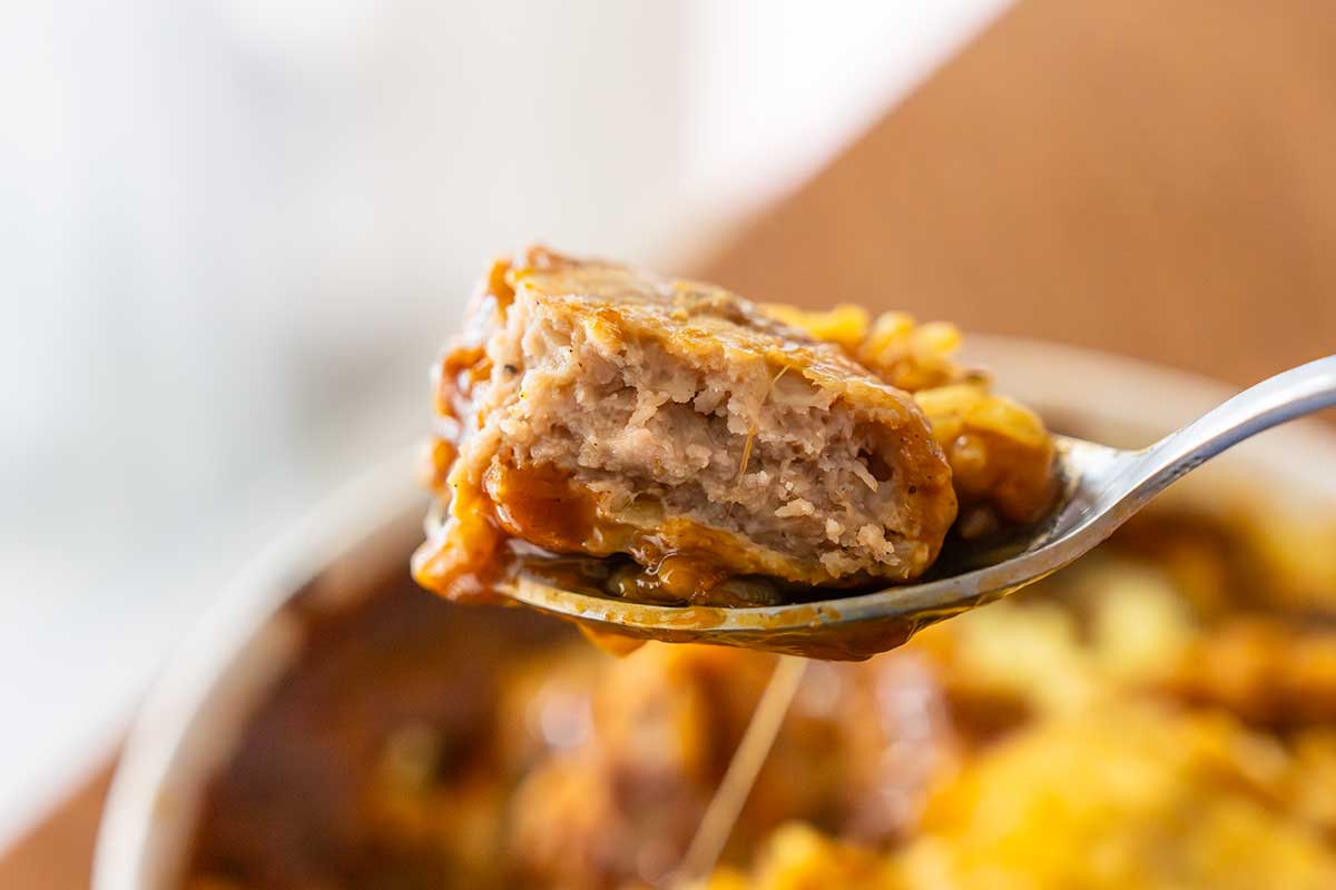 カレードリアの中心にハンバーグがのっていて、その上にチーズソースがかかっていますね。