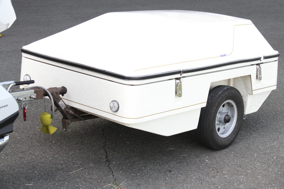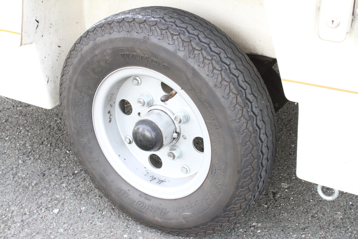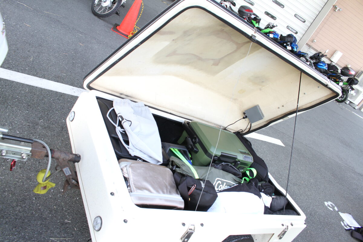 カーゴトレーラーのホイールとタイヤはモンキー(50)の8インチを使っています。中には電源を確保していて、ツーリング先で買ったお土産を冷やす冷蔵庫を入れています。