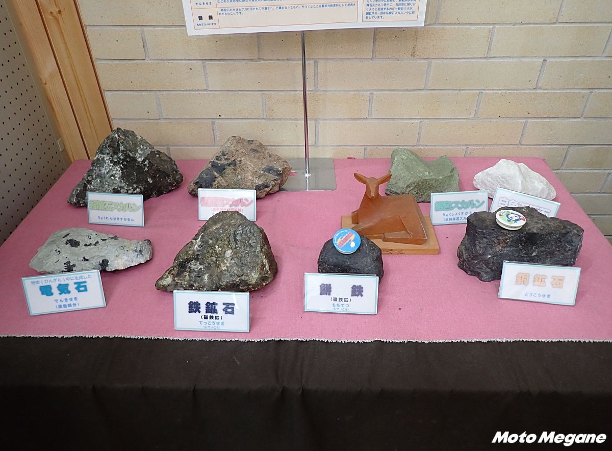 施設裏では甲子川と山の景色を眺められる。テラス席もあるので、こちらで景色を眺めながら食事を楽しむのも良い。食堂の端にはさまざまな「釜石鉱石」の岩石が展示されているので、時間があれば見てもおもしろい。