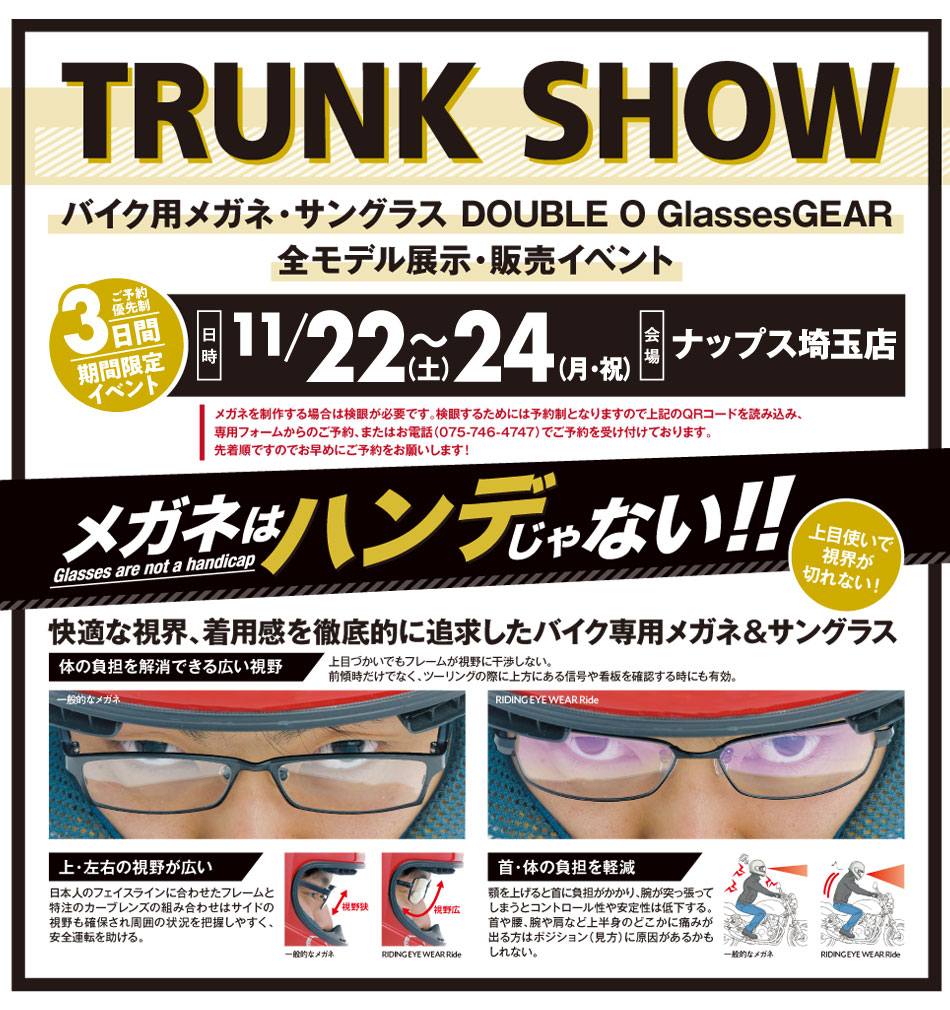 この度、バイク専用メガネの体験ができるイベント、「TRUNK SHOW」が下記にて開催される事となった。