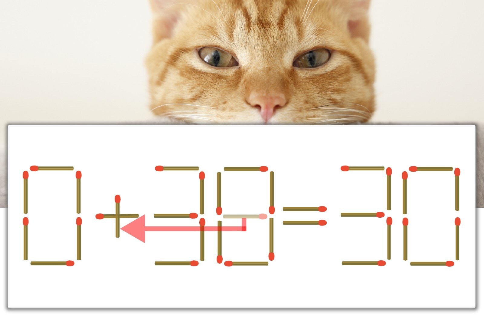 「8」を別の数字に変化させると答えが導き出せます。「8」のマッチ棒を1本移動して、「-」を「+」にしてみましょう。すると、「0+30=30」が成立します。