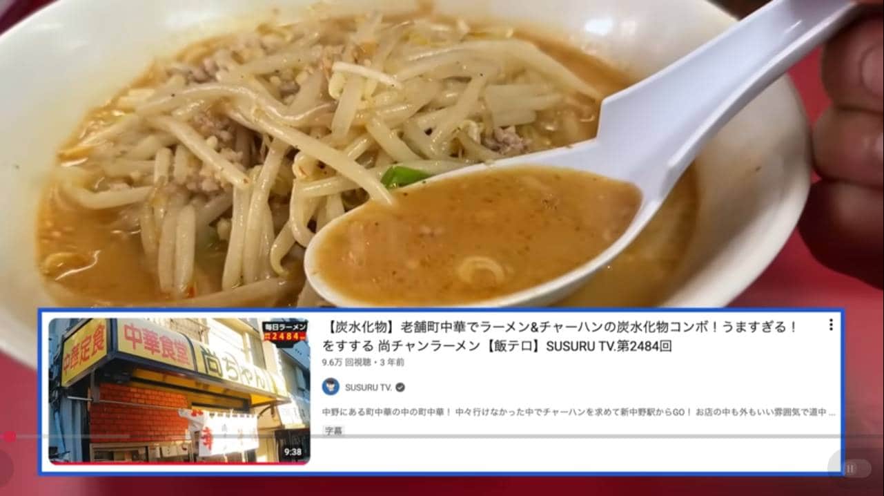 SUSURUは4日に青森でラーメンフェスを終え、一日前に東京に戻ったばかり。忙しいスケジュールの中でも毎日ラーメンを欠かさないSUSURUは、第2子誕生を心待ちにしながら近場の町中華でラーメンを啜ります。この日1件目のお店は、以前にも動画で取り上げた中野本町にある「尚チャンラーメン」。ボリュームのある味噌ラーメンと生姜焼きを堪能していました。