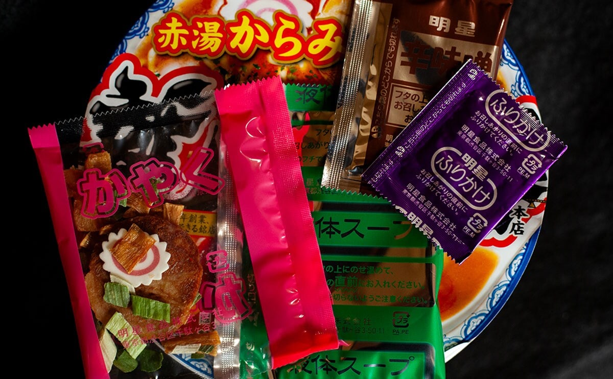 フタを開けると、4つの小袋が出てきました。先入れは「かやく」のみで、残りの液体スープ、辛味噌、ふりかけの3つは後入れです。