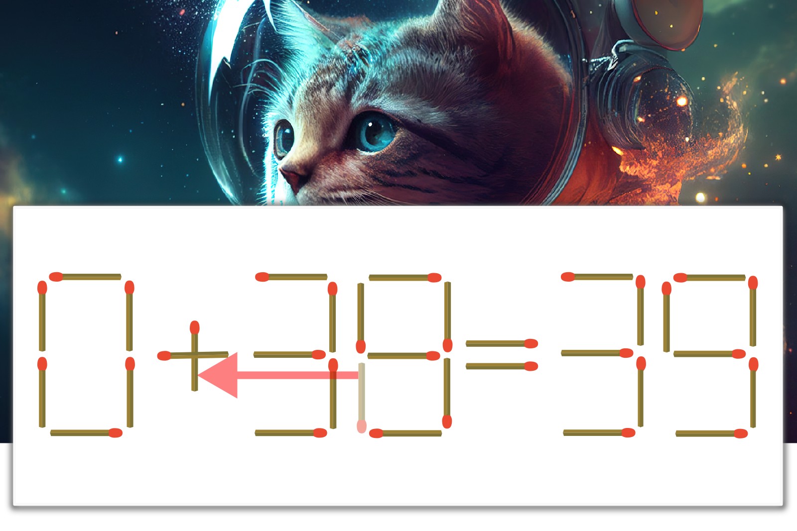 「8」を別の数字に変化させると答えが導き出せます。「8」のマッチ棒を1本移動して、「-」を「+」にしてみましょう。すると、「0+39=39」が成立します。