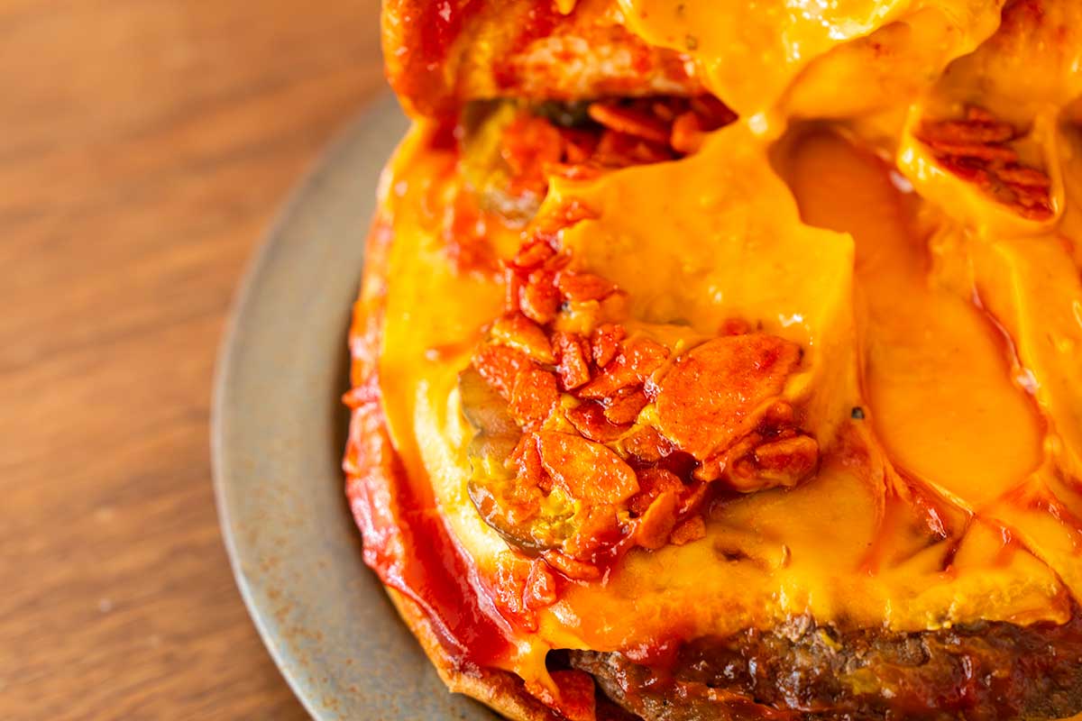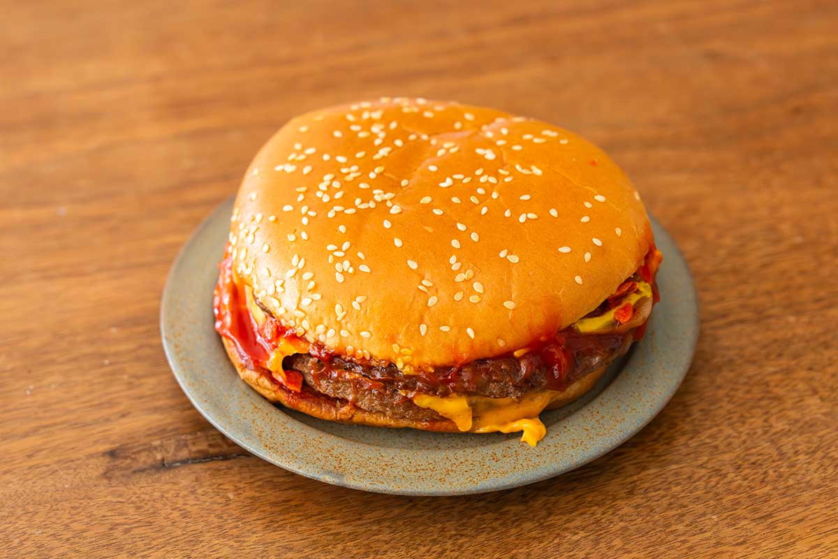 直火焼きの100%ビーフパティ2枚に、チェダーチーズを4枚、ピクルスを重ね、ケチャップとマスタード、さらにガーリックペースト、フライドガーリック、ガーリックパウダーの3タイプのにんにくに、チリペッパーとブラックペッパーを効かせた、ガツンとくるうまさの「特製ガーリックソース」と、クセになる辛さと旨味が特長の「スパイシーガーリックフレーク」で仕上げた本格チーズバーガーです。