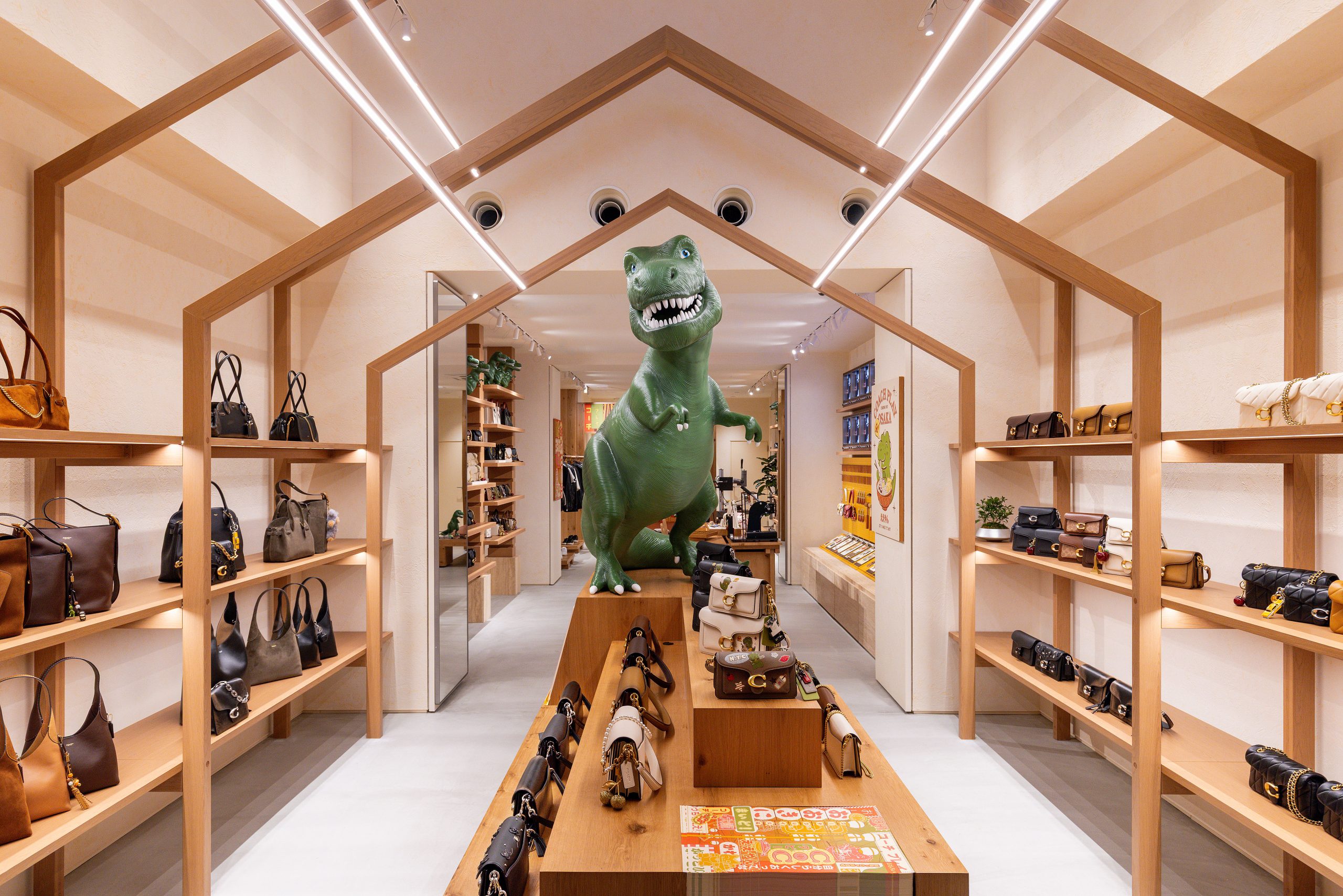 エントランスでは、レトロなフォントで描かれたコーチのサイネージがゲストを迎え、懐かしさとモダンな感性が融合した世界観を演出。店内に足を踏み入れると目に飛び込んでくるのは、コーチのアイコンキャラクター、恐竜の「Rexy(レキシー)」の大きなオブジェ。ポップな存在感とユニークな造形、鮮やかなカラーリングで、空間に遊び心と躍動感を添えている。またグラフィックアートで描かれたレキシーのビジュアルが壁面を彩り、都市のエネルギーとブランドのクリエイティビティが交差するダイナミックな雰囲気を創出している。フォトジェニックなレキシーの演出は、店内の随所にちりばめられている。