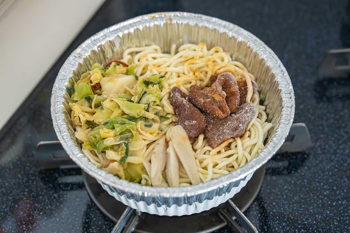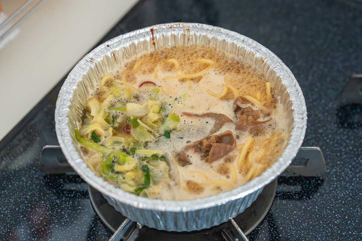 「もつ鍋 麺入り」の調理方法は、(1)鍋をガスコンロまたはIH調理器の中心に置き、弱火*で約3分加熱する、(2)火力を上げて加熱し、全体がぐつぐつ煮立ったらできあがり。