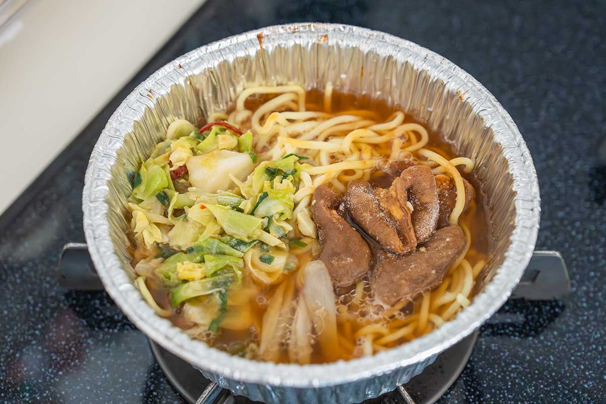 この商品は、にんにくとニラの風味が広がる、醤油ベースのもつ鍋に中華麺を加えた冷凍食品です。