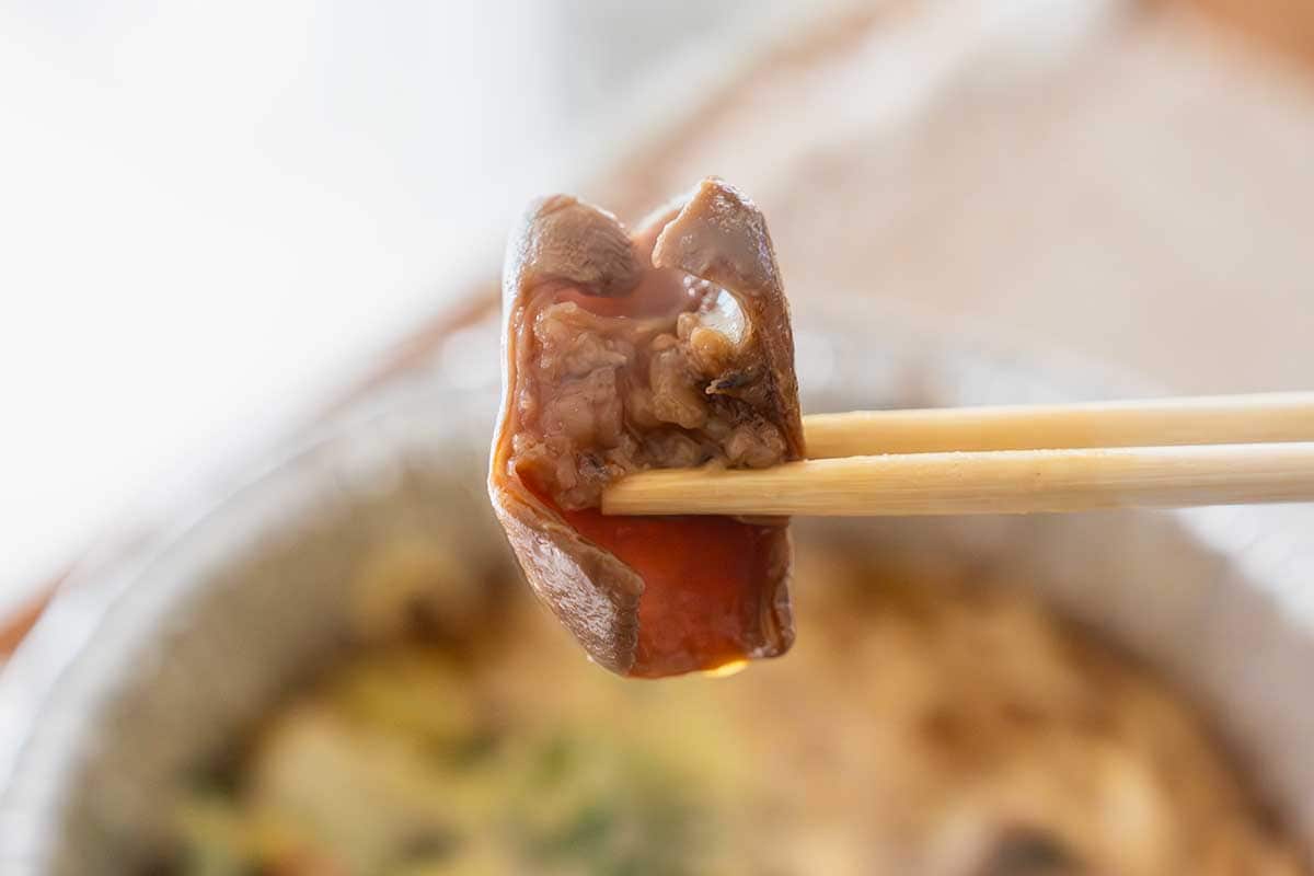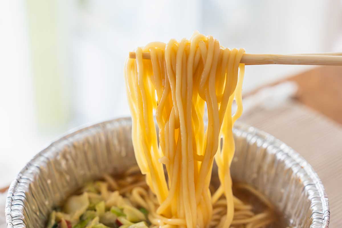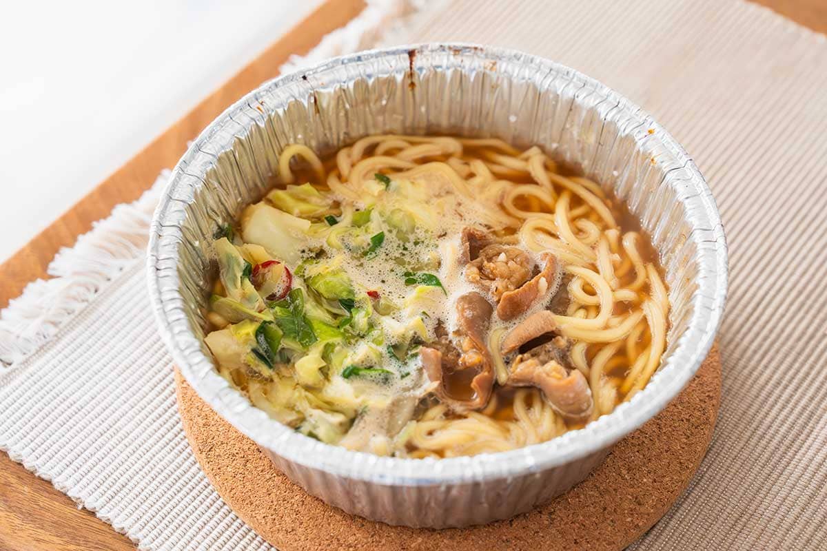 昆布やむろあじ削りぶしなどを使用した醤油ベースのスープは、もつやにんにくの旨みがきいた、しっかりとした味わいです。具材のもつは、ほどよい弾力と噛みごたえがありますね。キャベツの甘みや唐辛子のピリッとした辛み、にらやごぼうの風味も味わうことができ、かなり本格的なもつ鍋に仕上がっています。もちろん、なめらかな口当たりでもっちりとした食感の中華麺もおいしいですよ。