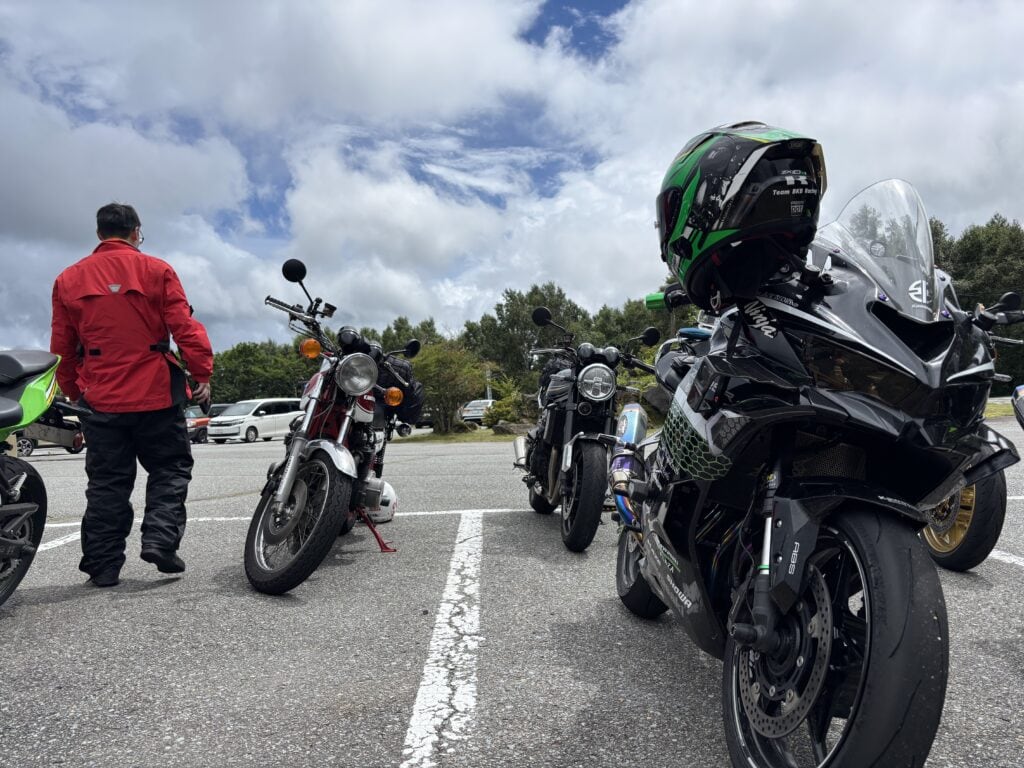 途中は雨模様でしたが、到着してレインウェアを脱ぎ出したら晴れ間が…。帰路は国道299号線、つまり麦草峠越えです。つづら折りの峠越えルートは、ライテクと経験値、バイクの性能差がモロに露呈するので、インカム通話が出来れば便利。先行者が後続者に、道路の状況や注意点を知らせられるからです。実はこれこそ、危険回避&安全運転につながる術で、物理的に可能ならば、できるだけ多くの参加者でインカムペアリングすることをオススメします。