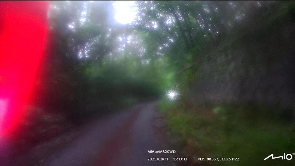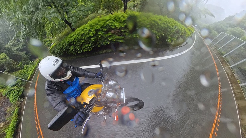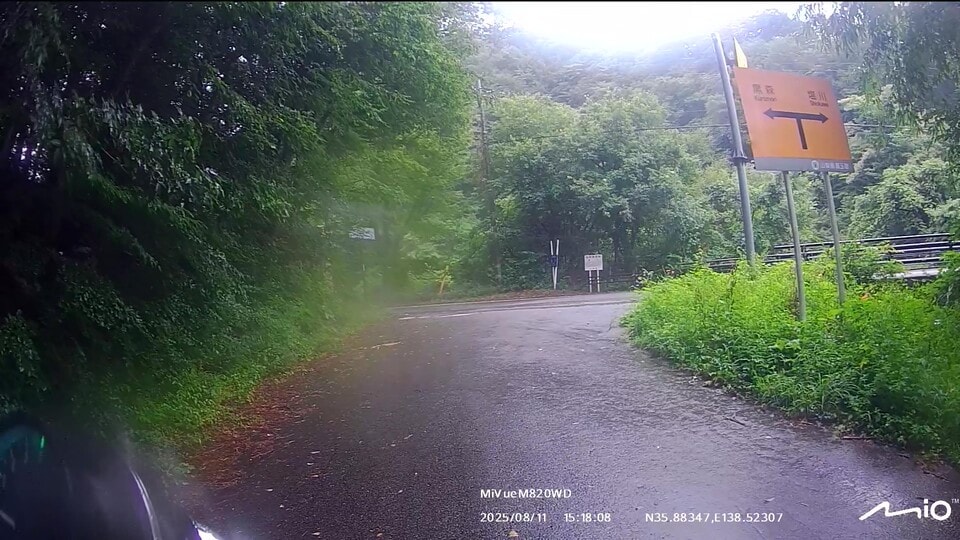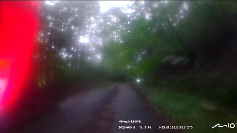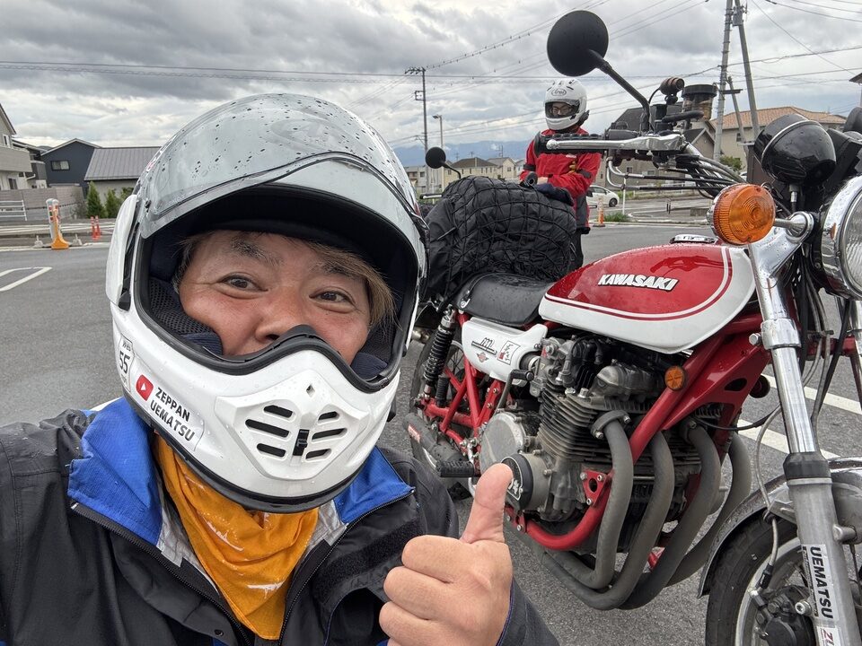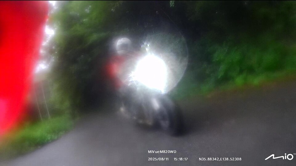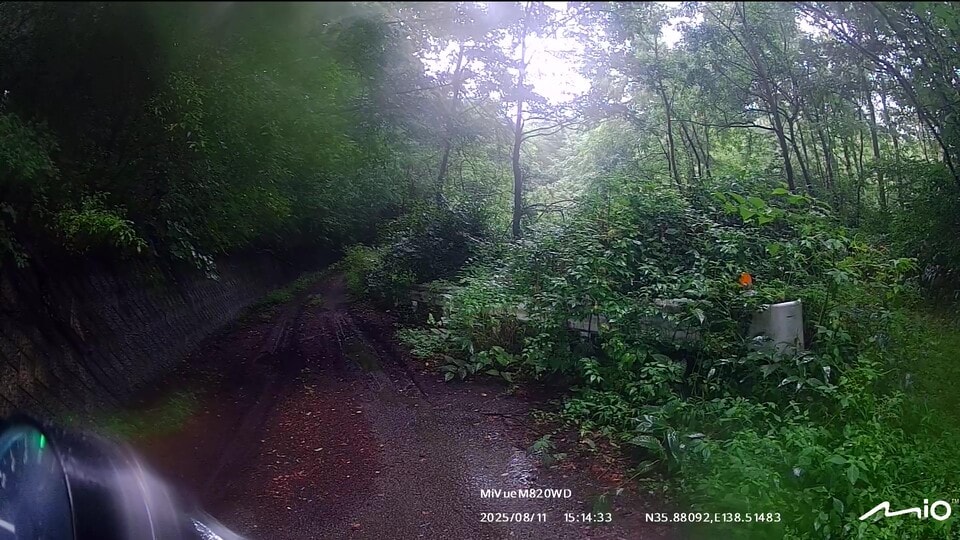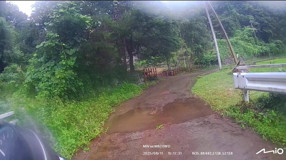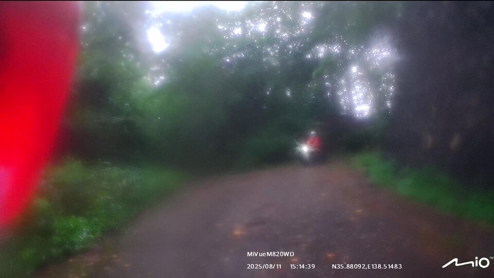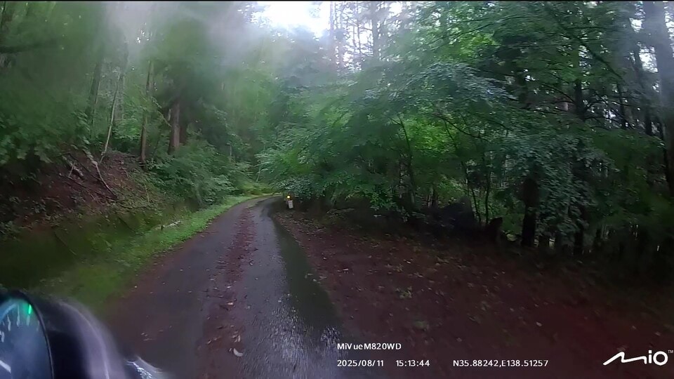 インカムのペアリングを確認して、いざ甲府へ!案の定、みずがき山近くで土砂の流出跡が幾つも出現しました。アドベンチャーやオフロードバイクなら難なく通過できる状況ですが、僕はカズ兄のZ2、ナオキくんはZ900RSというバリバリのネイキッドモデルで、雨降りの中、木々が覆いかぶさる道幅2m弱の荒れた舗装路、時々土砂の流出による泥路面に出くわすというシチュエーション。特にネイキッドバイクでマディな路面を走ったことのないナオキくんにとっては、苦行でしかないと思いました。