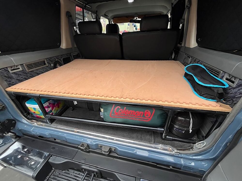 78プラドは、山にキャンプに行くときに必要な「道具」的な感じに思ってます。なので、カスタムも「キャンプで便利」とか「山を気持ちよく走れる」点が大事です。なので社内後方は3rdシートを取っ払い、自分でイレクターパイプを切ってベットKITを作ってキャンプギアの積みやすさや車泊の快適性を上げました。