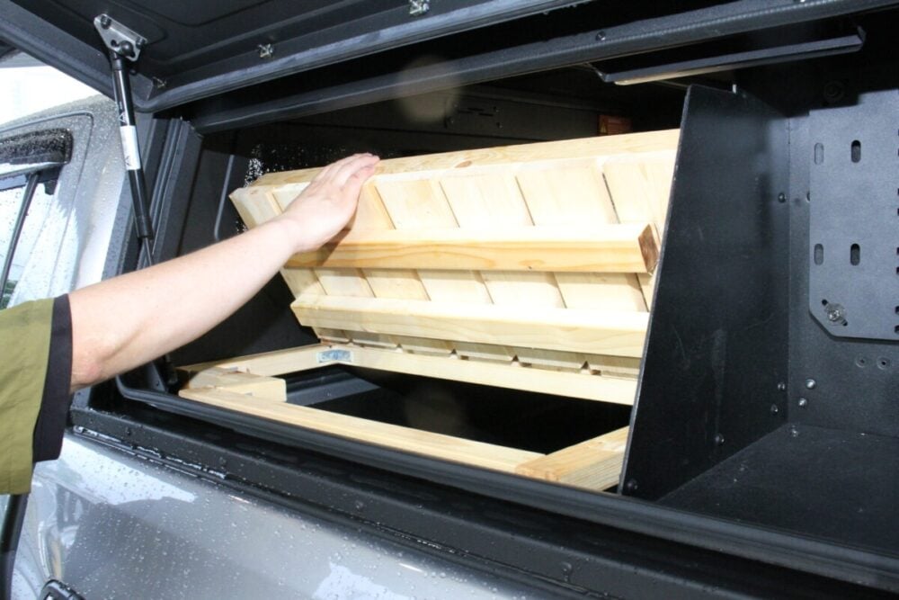 リヤのボックスや仕切り板はDIYで製作。Alu-Cab公式サイトにキャノピー部分の寸法が公開されているので、それを参考に採寸すればカンタンに作れるとのこと。ボックスにはキャンプ道具やコーヒー道具などを入れている