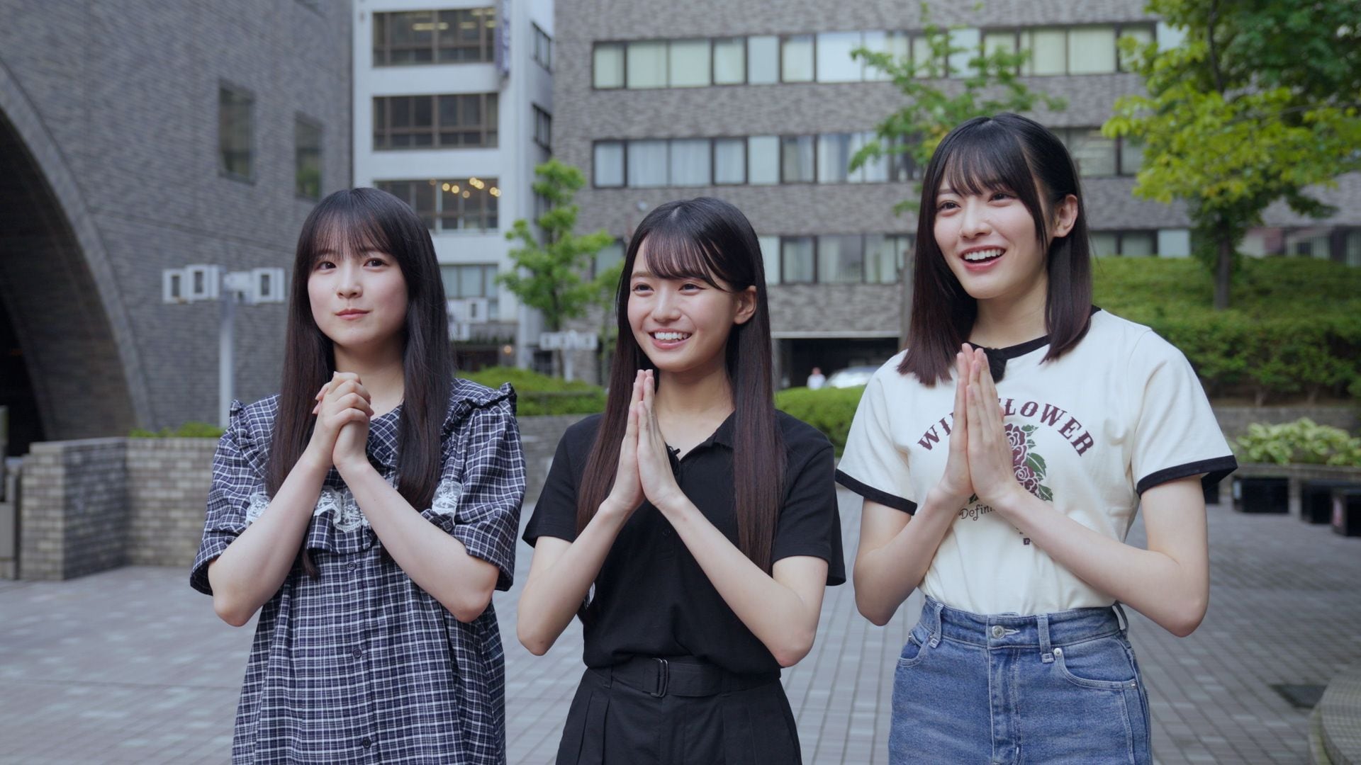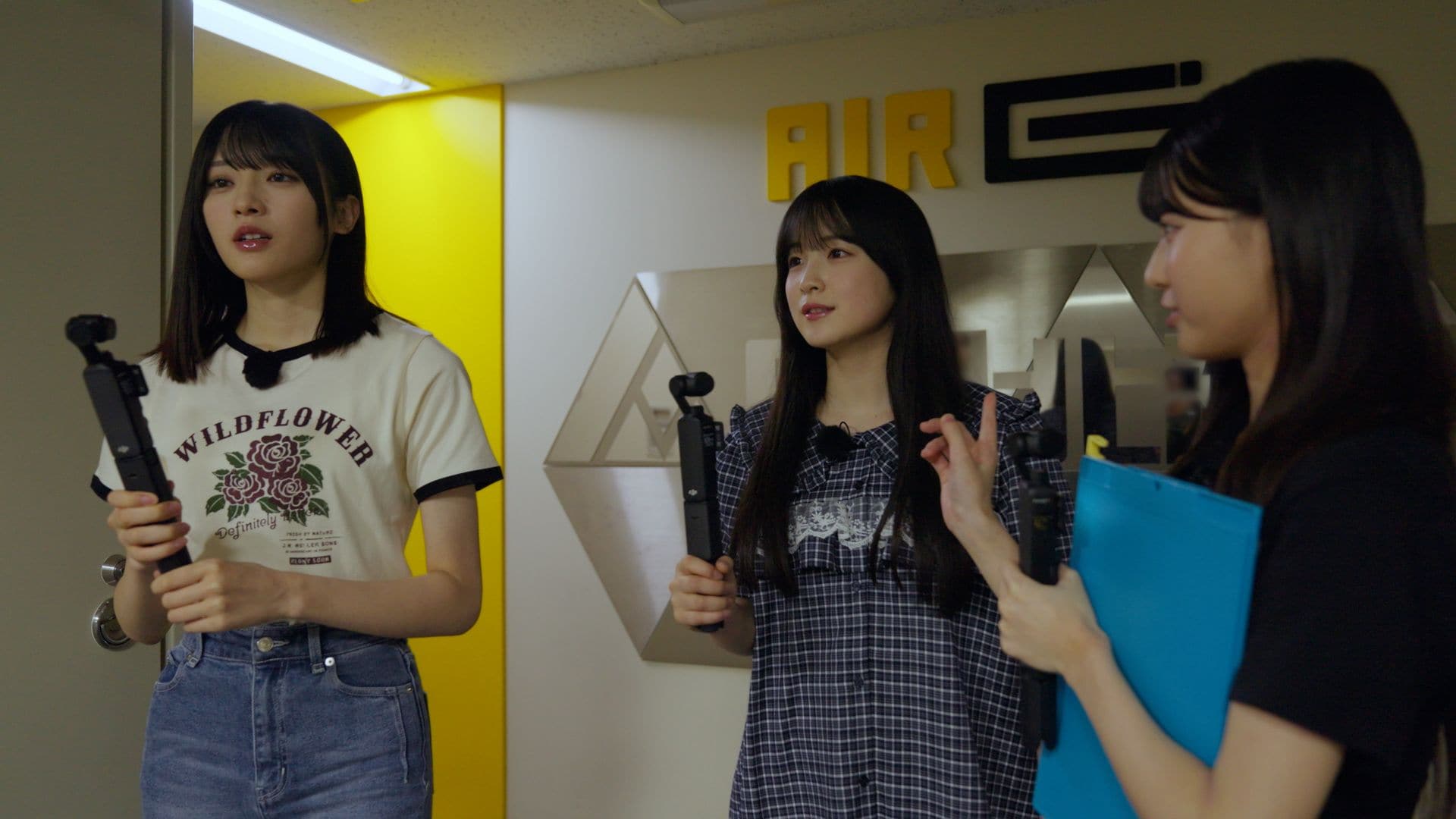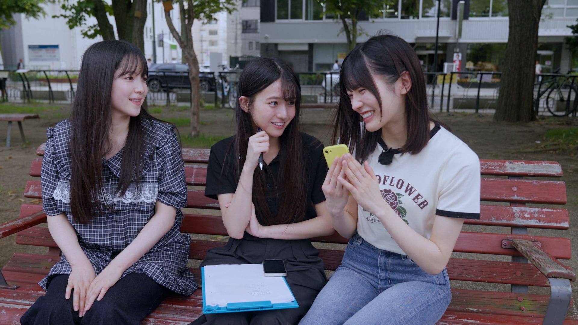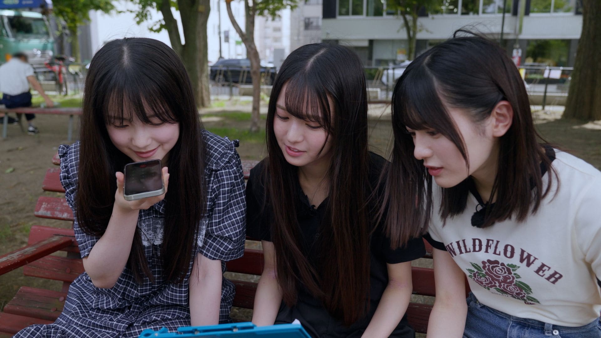 3人は、より多くの人に曲を聴いてもらえそうなラジオが気になった様子。スマホを手に熱心にラジオ局に関する情報を探る瀬戸口と大越をよそに、あくまでもマイペースな鈴木。大越は2人に「(ラジオに)金川さんが出てます!」と報告し、北海道出身の先輩・金川紗耶(4期生)がレギュラー番組を持っているラジオ局に可能性を見出したようだ。「交渉したことない!なんかヤバいね。変なこと言っちゃわないかな」と不安そうな大越。そこで、電話での交渉をシミュレーションすることに。鈴木と大越が電話で伝えるべきことを言い、瀬戸口がメモを取る作戦だ。
