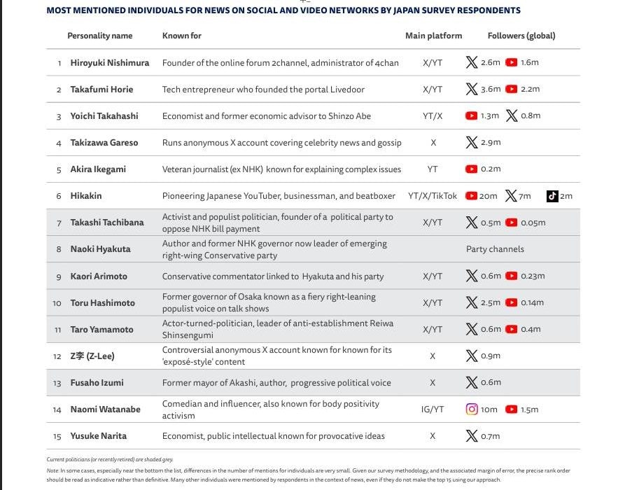 また、日本には芸能ゴシップや犯罪ニュースを専門に扱う、発信内容の薄いインフルエンサーアカウントが多数あるとのこと。XやYouTubeが日本のニュースにおいて重要な役割を果たしていることから、最近ではポピュリスト政治家によるソーシャルメディアの活用が話題になっていると分析しています。