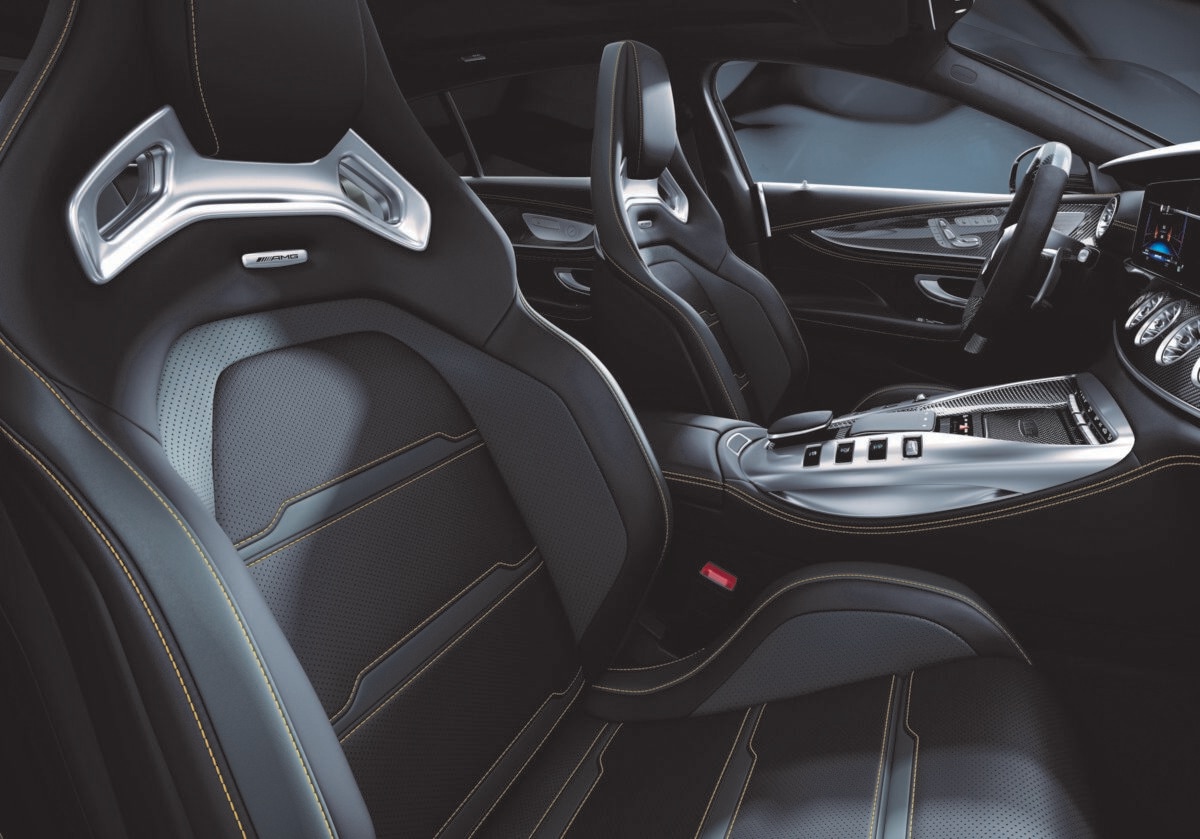 本モデル限定装備の「AMG パフォーマンスステアリング(カーボンファイバー/MICROCUT)」、「Final Edition」のバッジがあしらわれたセンターコンソールに加えて、通常モデルでは有償オプションの「フルレザー仕様(ナッパレザー/MICROCUT、ブラック(イエローステッチ入)」、「AMG パフォーマンスシート」、「イエローシートベルト」、Mercedes-AMG GT 63 S 4MATIC+では有償オプションの「AMGカーボンインテリアトリム」を標準装備し、トップパフォーマンスを感じさせる仕様になっています。