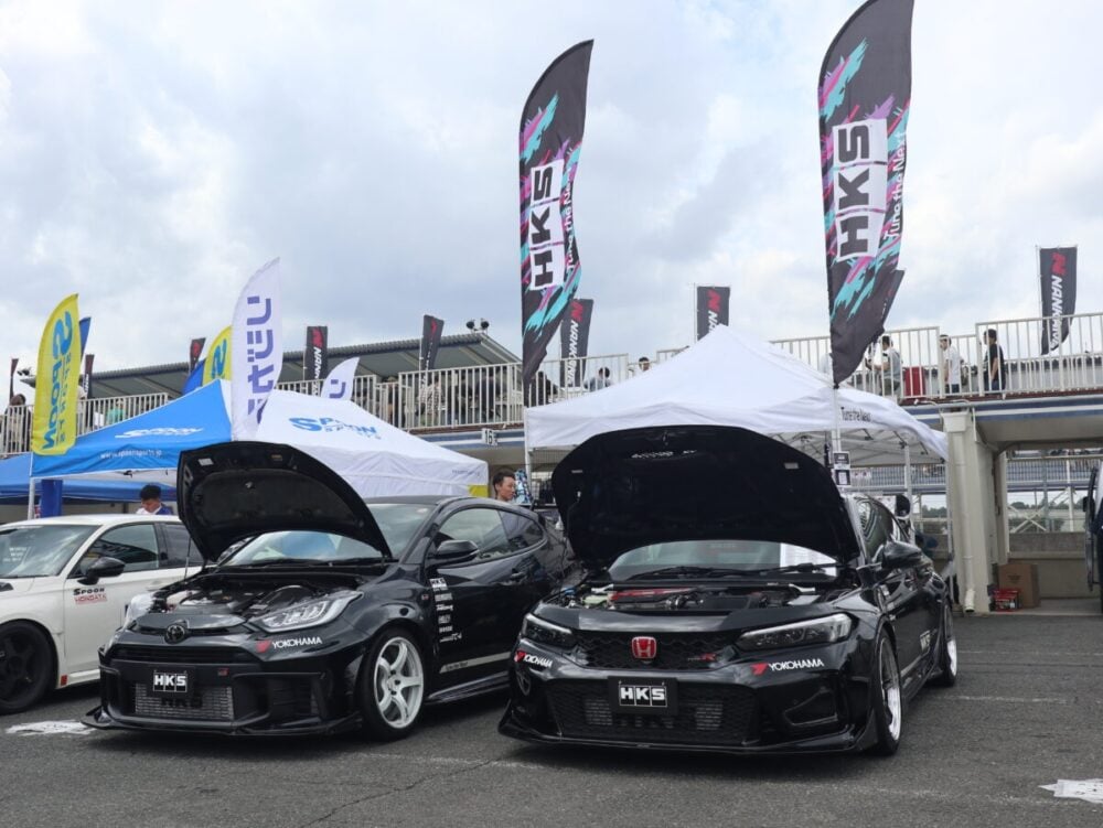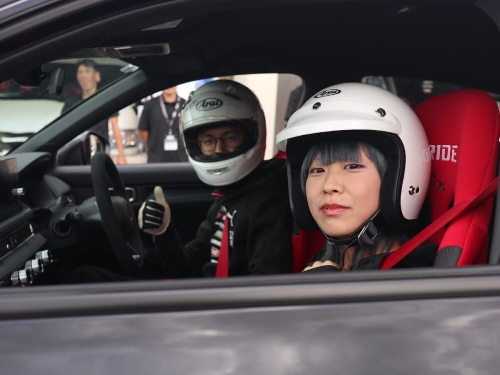 筑波サーキットで行われたイベント「ハイパーミーティング」では、HKS・FL5シビックタイプRデモカーの同乗試乗が実施されました。一般ユーザーもその走りのしなやかさを実感していました。