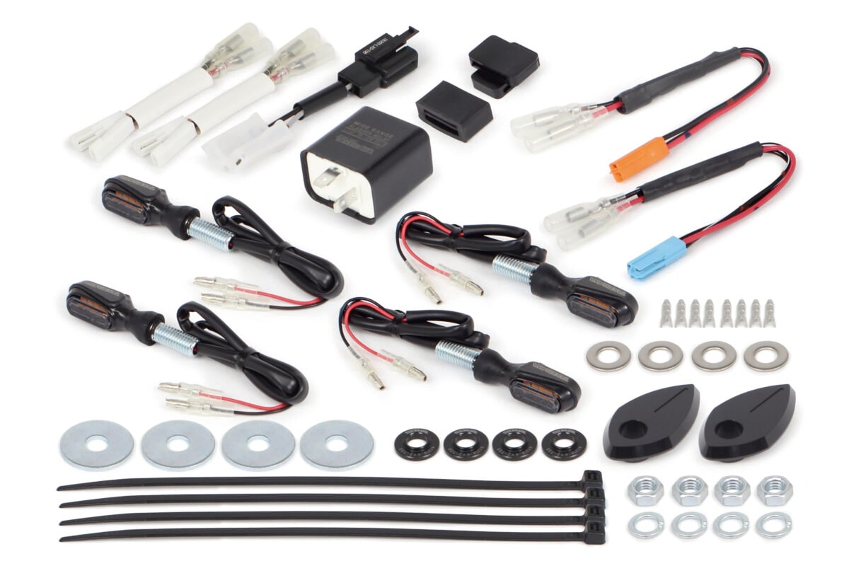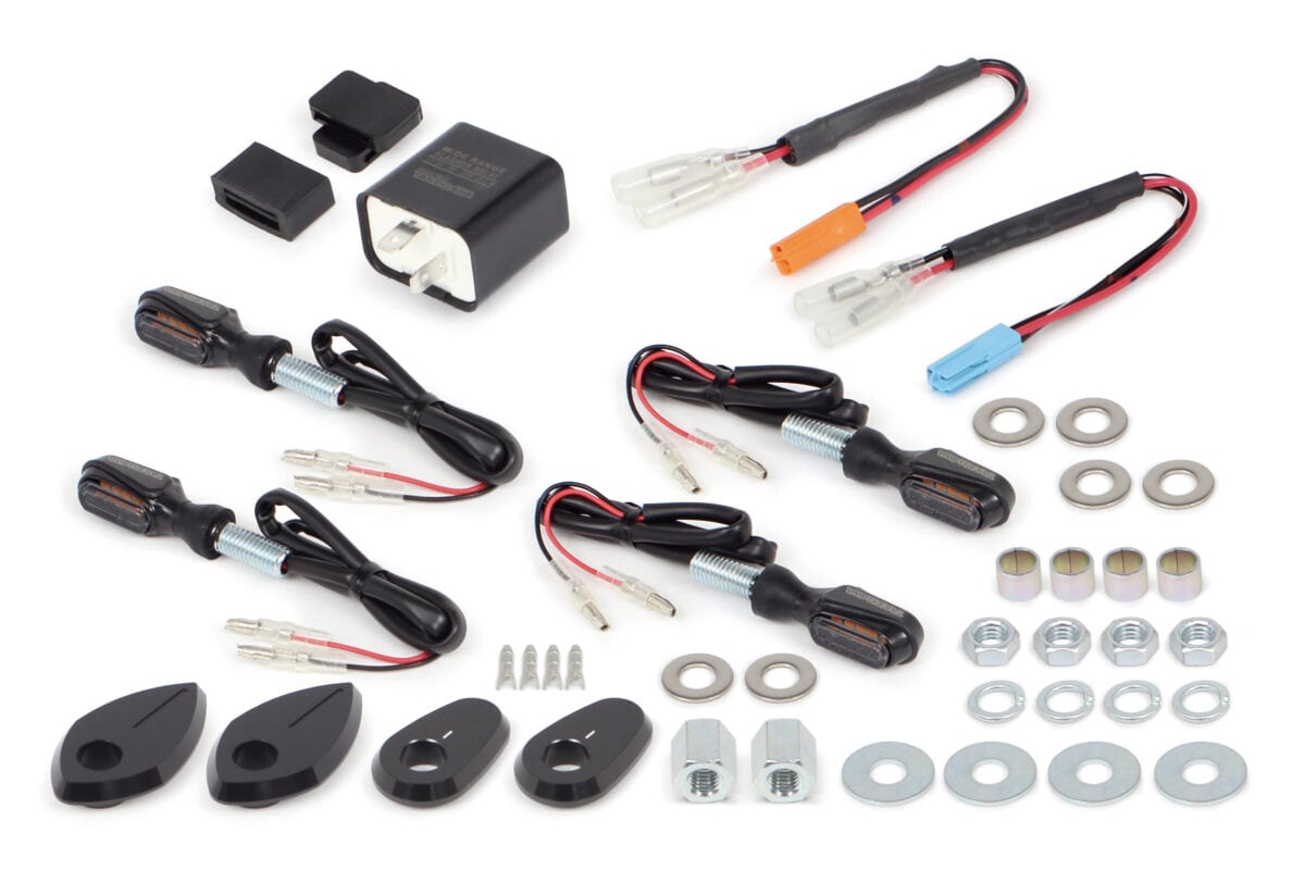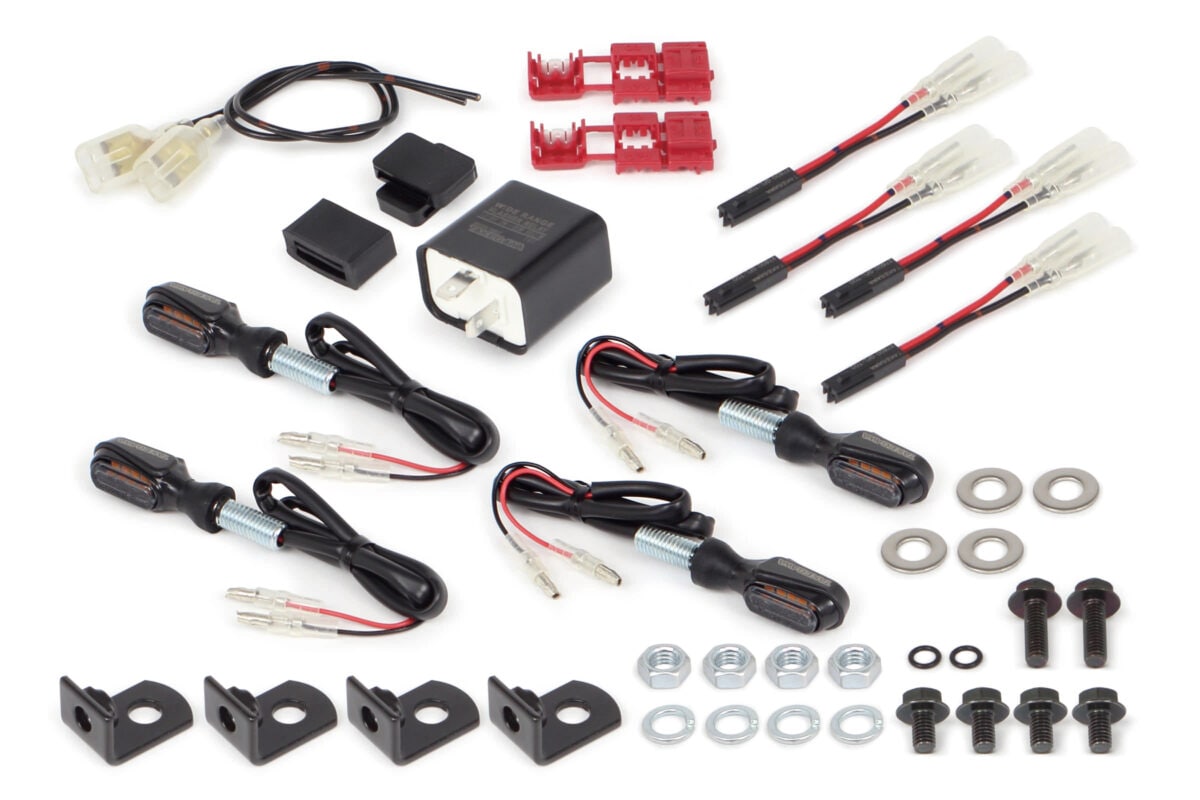 車両専用キットは、ストリームラインミニLEDウインカー(4個)にワイドレンジフラッシャーリレー(1個)、フロント用ブラケット(2個)、リア用ブラケット(2個)、
