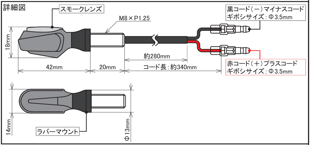 ウインカーボディーのネジ部には、M8 ピッチ1.25、ネジ長20mmを採用し、汎用性に優れています。