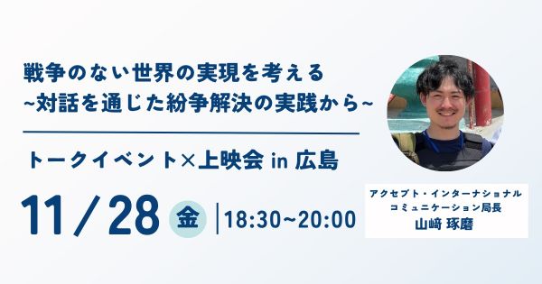 ソマリア、イエメン、パレスチナなど、アフリカや中東などで紛争解決に取り組む国際NGOアクセプト・インターナショナル(東京)が、11月28日(金)に広島市のVILLENT広島で、対話を通じた紛争解決の実践と平和の実現についてのトークイベント「戦争のない世界の実現を考える~対話を通じた紛争解決の実践から~」を開催する。