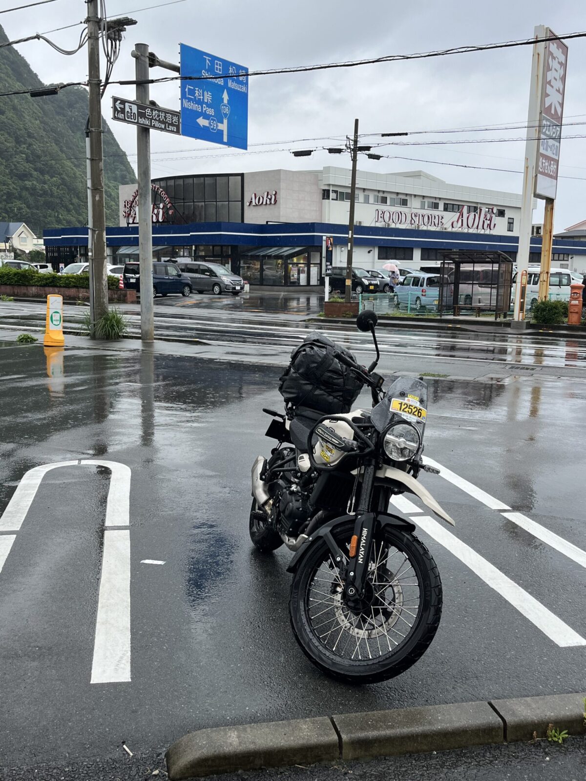 牧場の家から海沿いの136号までは急坂林間くねくね下り道ですが、HIMALAYANはこういう道でも不安なくスイスイ行けちゃうのがスゴイ。まあまあな雨でしたが新型レインスーツ着用したワタクシ、無敵でございます。時刻は午後15時過ぎ、そろそろ買出ししてキャンプ場へむかいます。