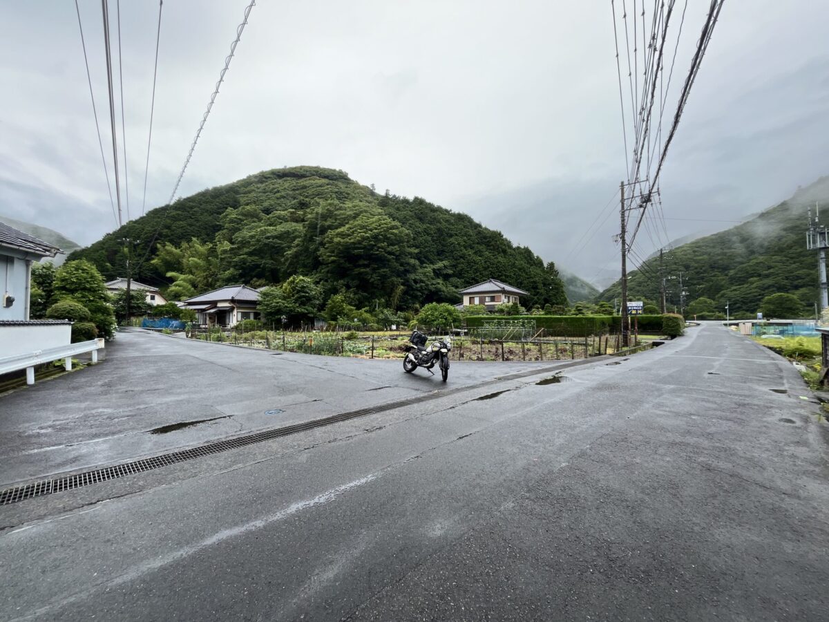 ここから県道59号へ左折、途中電柱に案内があるのでわかりやすい。最後にこの路地をバイクの後ろのほうへ曲がり集落を抜けて山道にはいります。