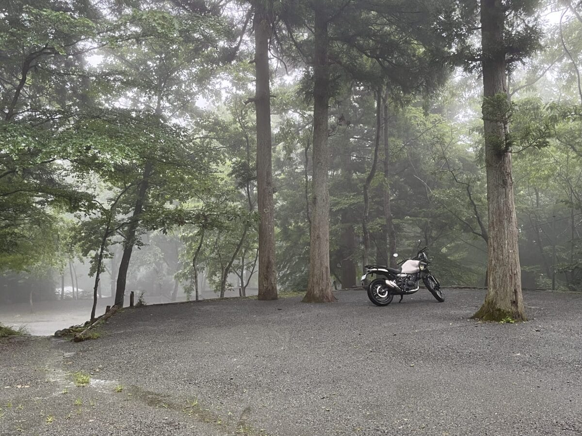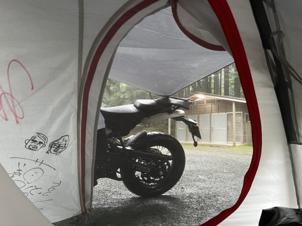 平日、土砂降り、バイクでソロキャンプ。まあ、普通はキャンセル案件ですよね(笑)。管理人さんには途中から到着時刻を告げ、現場で待ち合わせ。