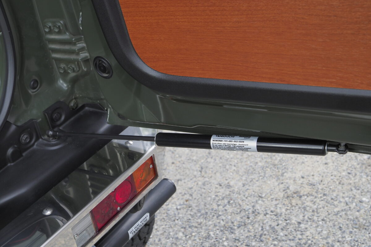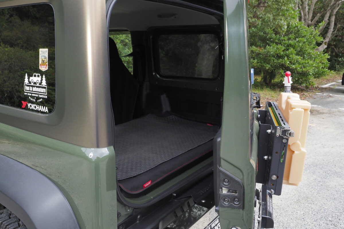 現行ジムニーのJB64、JB74オーナーならご存じのことだろうが、リアゲートの開口角度が意外と少ないのだ。ほぼ70度未満といった開き具合で、大きな荷物や、長い荷物を積もうとした際に、ゲートが邪魔になる。これがしっかり開いてくれればなぁという意見は結構聞いていた。