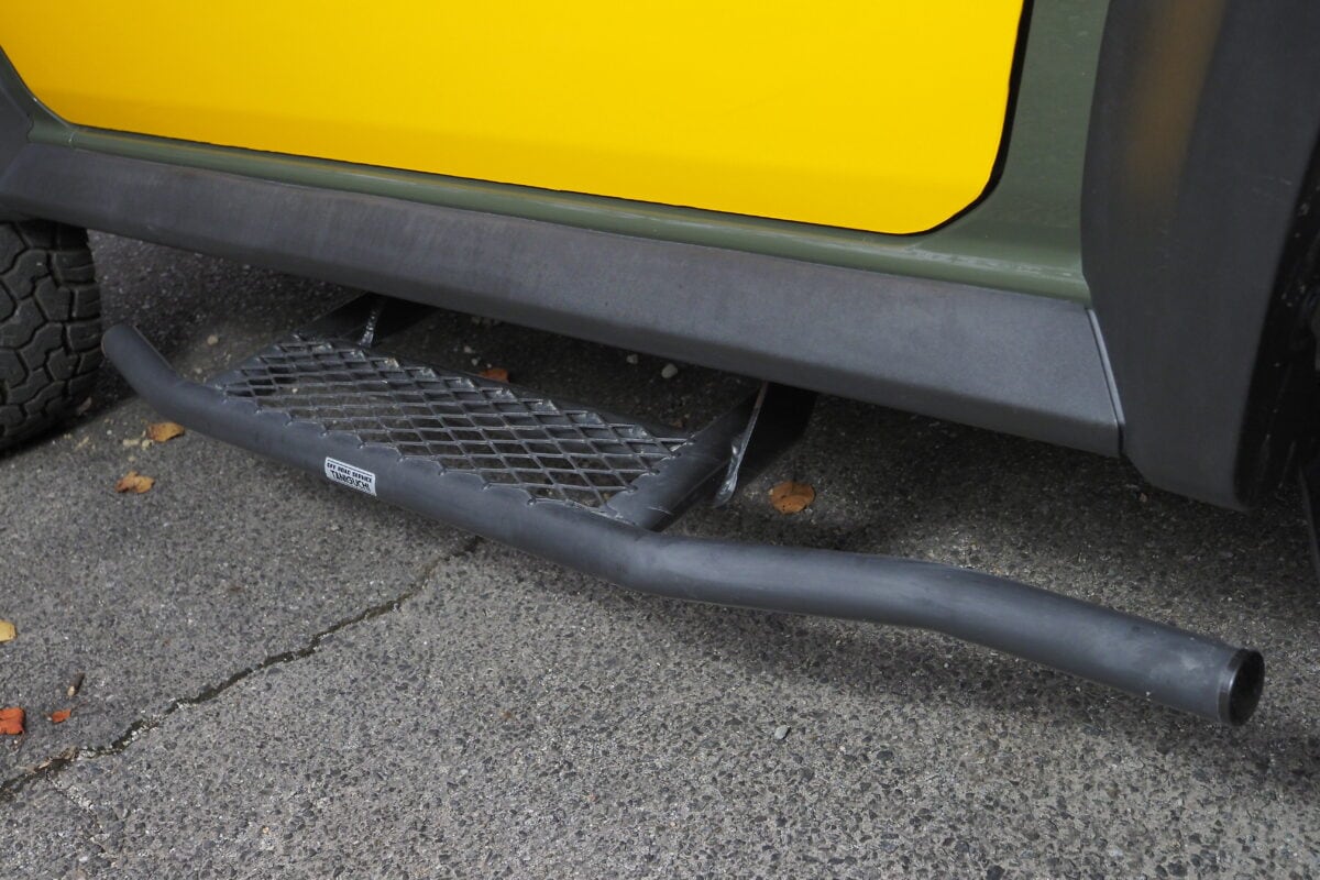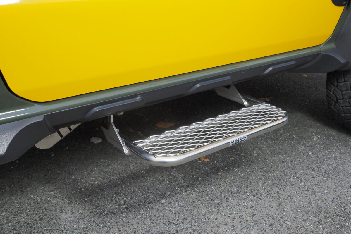 一般的にサイドステップは、ルーフラック装着時の足場や、リフトアップ後の乗降を補助する目的で使われる。しかし、オフロードサービスタニグチのサイドステップはそれだけではない。最大の特徴はメッシュ構造であること。靴底についた泥や雪を踏み落とせるため、車内を汚さずに済むのだ。冬のアウトドアシーンでは特に重宝するアイテムである。コンパクトなサイドステップと、ボディと一体感のあるバータイプの2種類が用意されている。