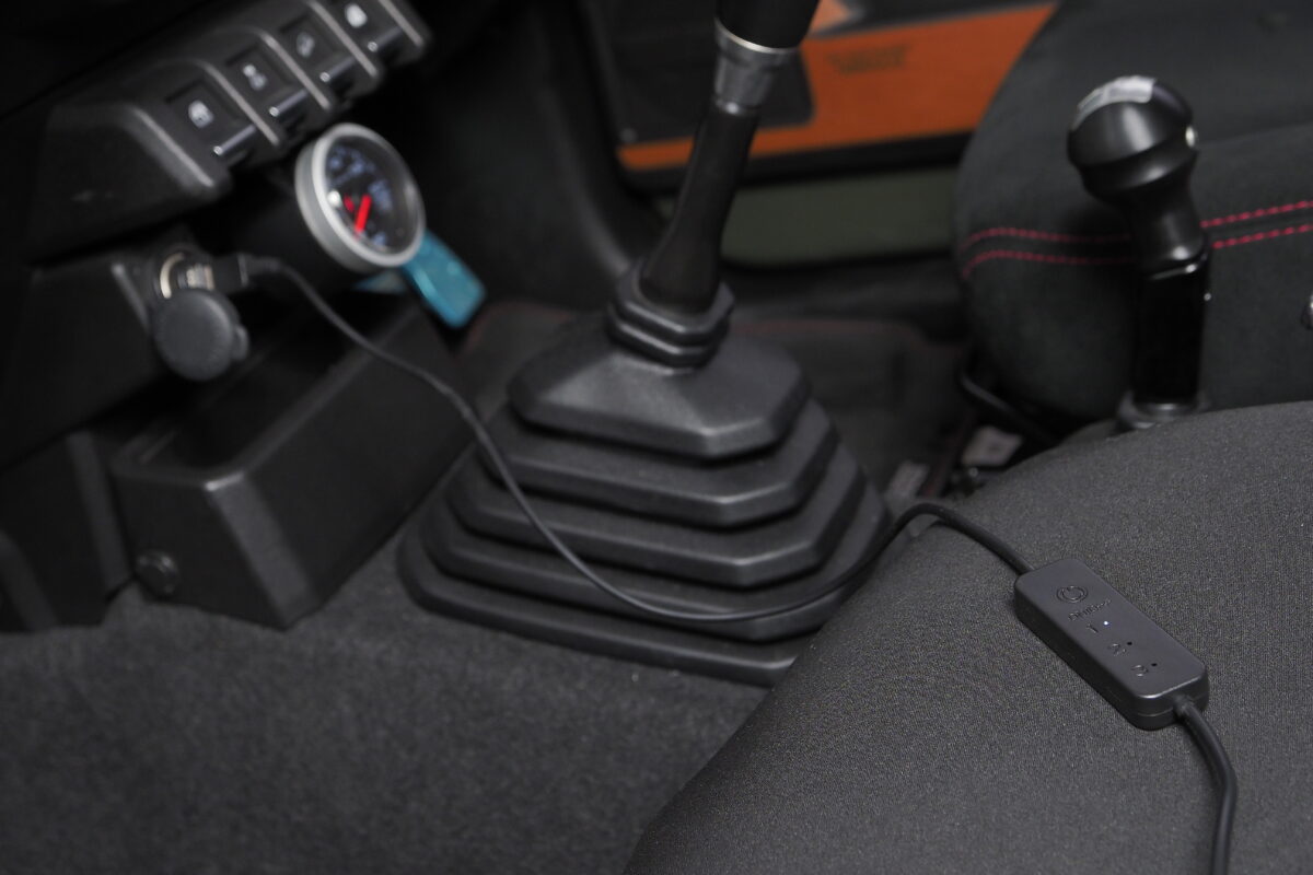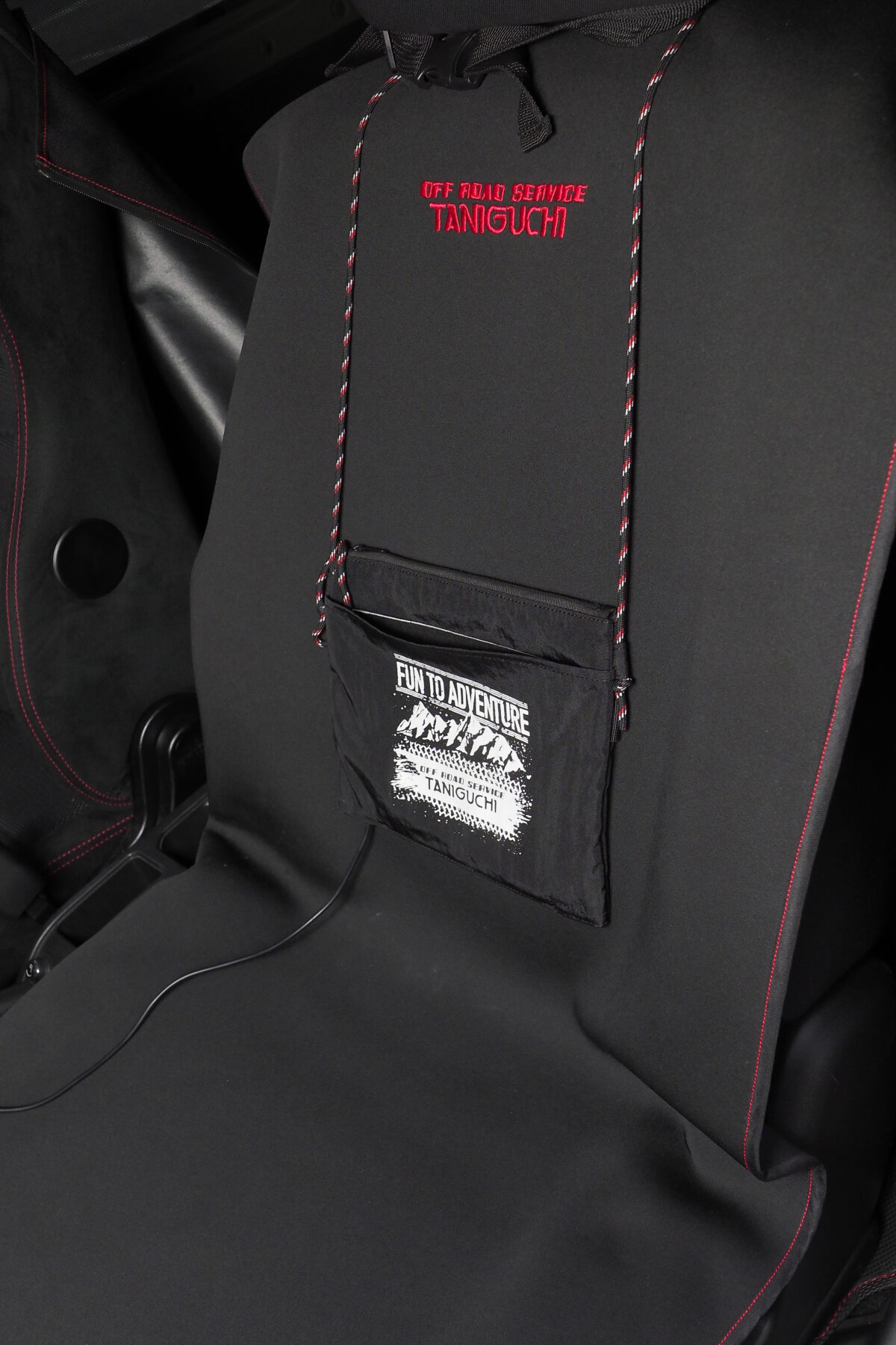 ちょっとした荷物を入れる定番アイテム、サコッシュにもタニグチ流の工夫が光る。超薄型ヒートパッドを内蔵し、モバイルバッテリーを接続すれば発熱してしっかり暖かい。さらに車内ではUSB接続してシートヒーターとして使用可能だ。現行ジムニーの純正シートヒーターは座面のみを温める構造だが、このサコッシュなら腰もポカポカ。ロングドライブ時の快適性が格段に向上する。