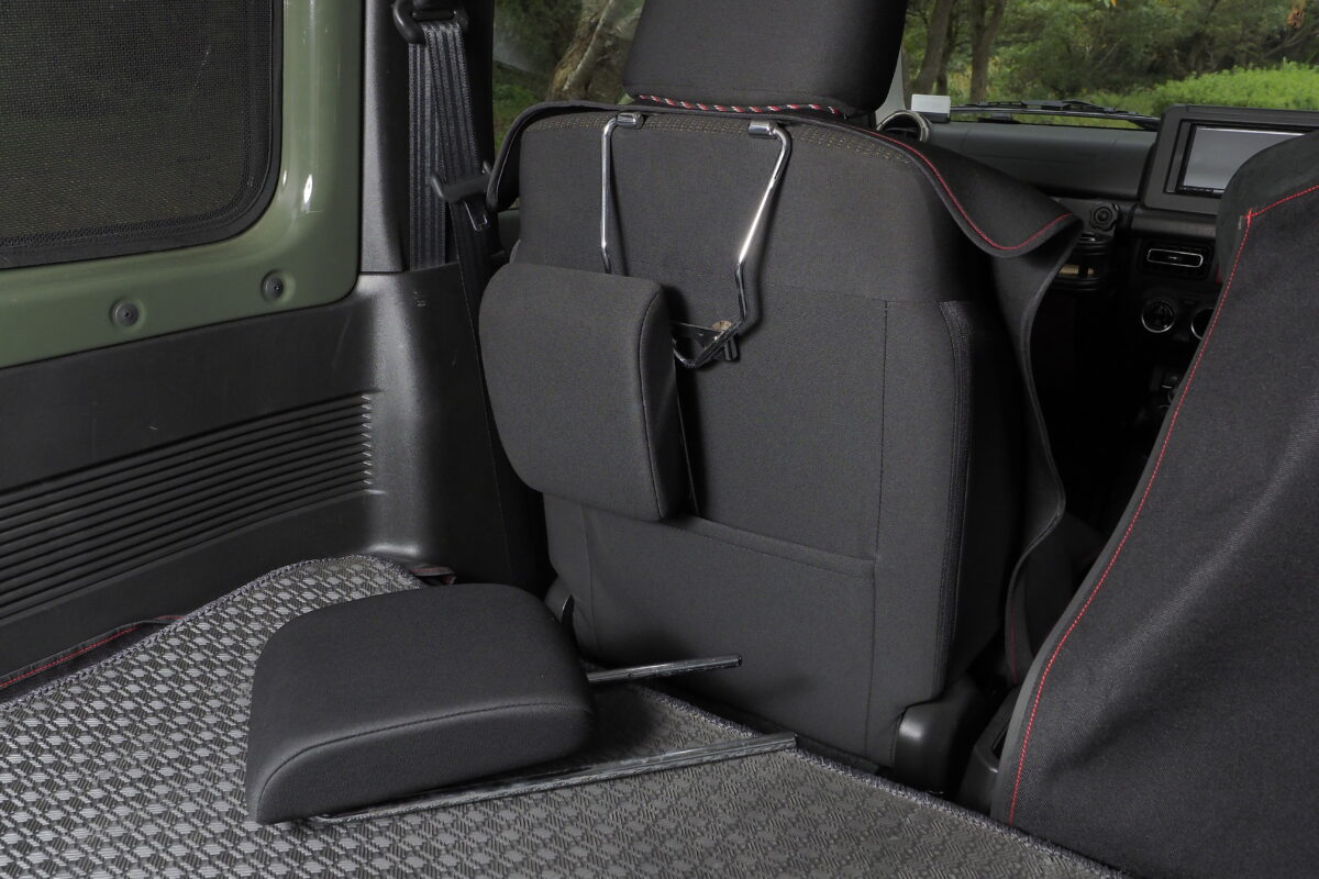 リアシートを倒してフラット化して使うオーナーが多いJB64/JB74。だが、その際に困るのがヘッドレストの置き場だ。この「ヘッドレストホルダー」は、リアシートのヘッドレストをスマートに保持できる便利グッズ。フロントシート用もラインナップされており、両方を併用してもOK。車内整理の悩みをすっきり解消してくれる。