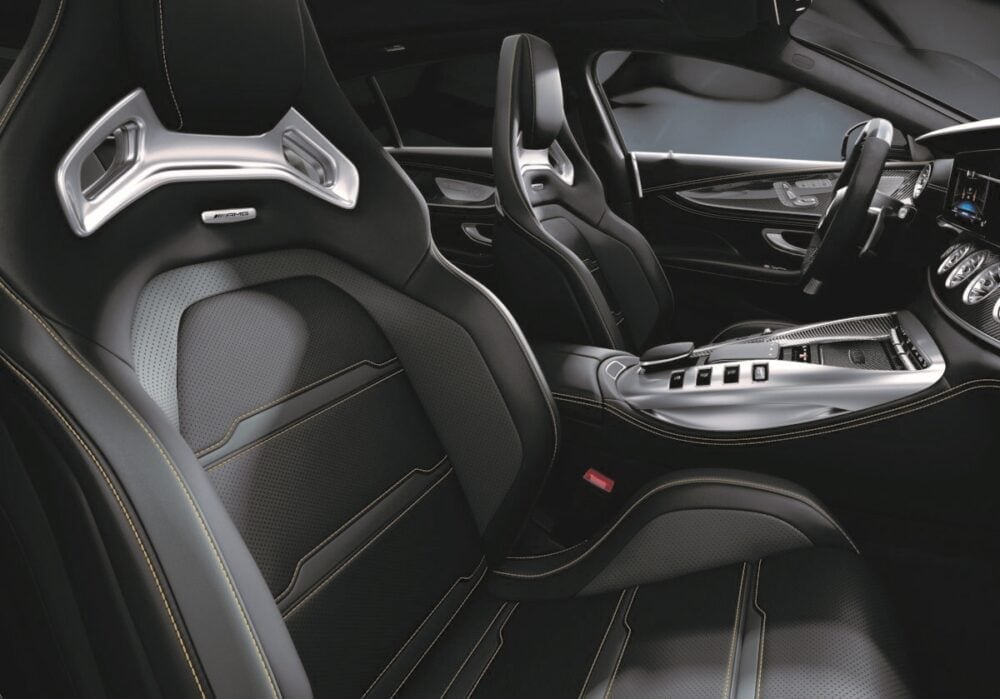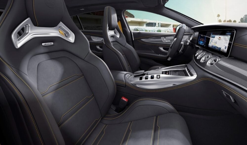 本モデル限定装備の「AMG パフォーマンスステアリング(カーボンファイバー/MICROCUT)」、「Final Edition」のバッジがあしらわれたセンターコンソールに加えて、通常モデルでは有償オプションの「フルレザー仕様(ナッパレザー/MICROCUT、ブラック(イエローステッチ入)」、「AMG パフォーマンスシート」、「イエローシートベルト」、Mercedes-AMG GT 63 S 4MATIC+では有償オプションの「AMGカーボンインテリアトリム」を標準装備し、トップパフォーマンスを感じさせる仕様になっています。