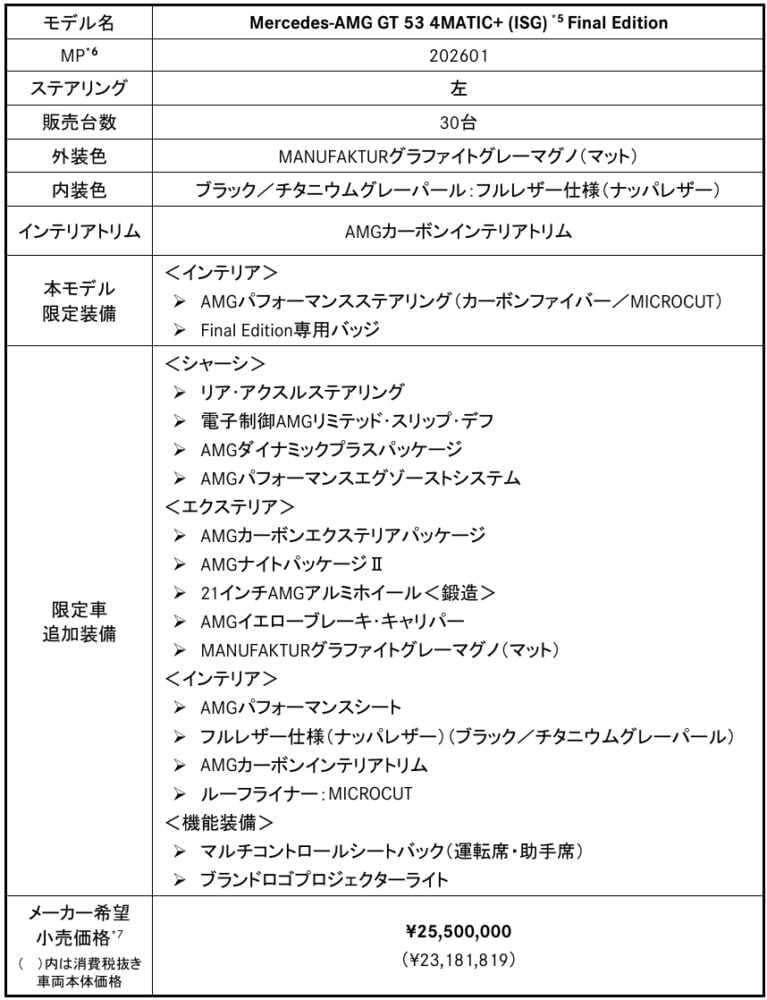 メルセデス・ベンツ日本合同会社は、AMG GT 4ドアクーペの集大成として「Mercedes-AMG GT 53 4MATIC+ (ISG) Final Edition」と「GT 63 S E PERFORMANCE Final Edition」を発表し、2025年11月20日より全国で注文受付を開始した。