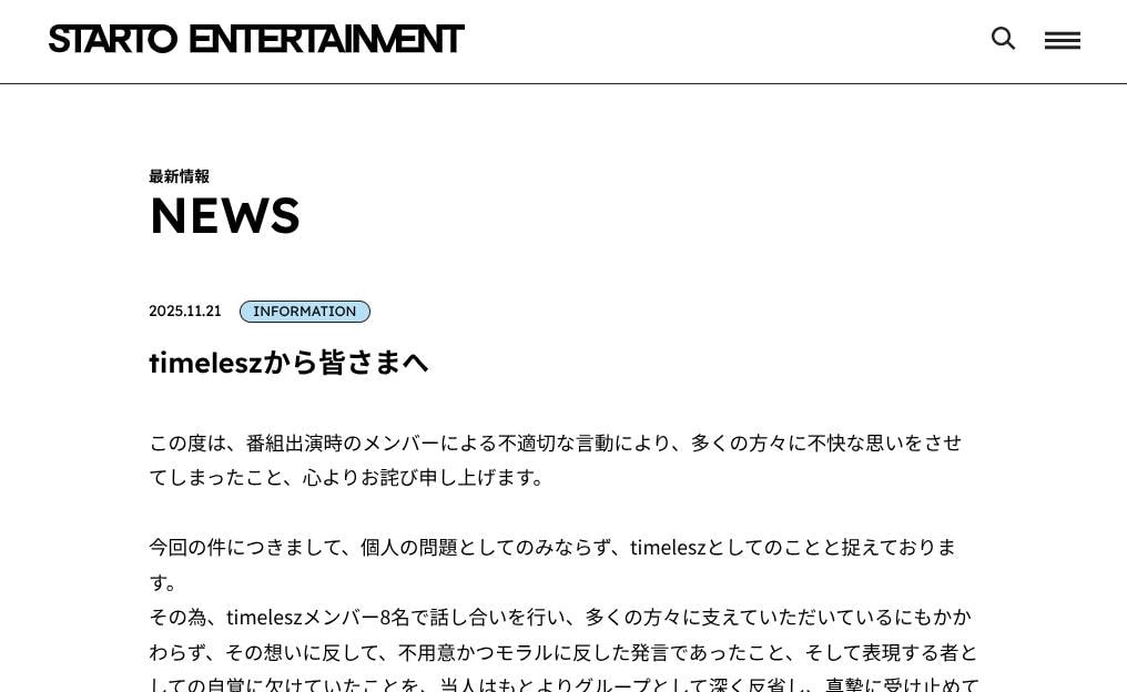 21日、STARTO ENTERTAINMENT社のサイトで、「timeleszから皆さまへ」と題する声明が発表されました。声明はメンバー8人の署名が入っており、「この度は、番組出演時のメンバーによる不適切な言動により、多くの方々に不快な思いをさせてしまったこと、心よりお詫び申し上げます」と陳謝するとともに、事案を個人の問題にとどめず「timeleszとしてのこと」と受け止めていると強調しました。