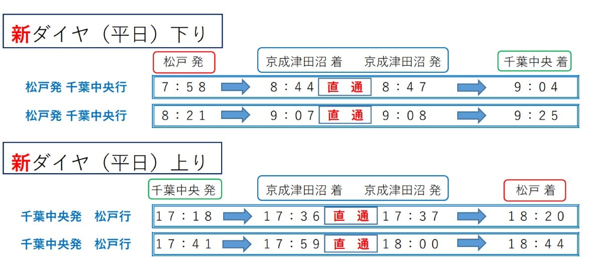 平日日中時間帯に実施している松戸線と千葉線の直通運転について、新たに4本が直通運転となります。これにより、京成津田沼駅での乗り換えが解消されます。
