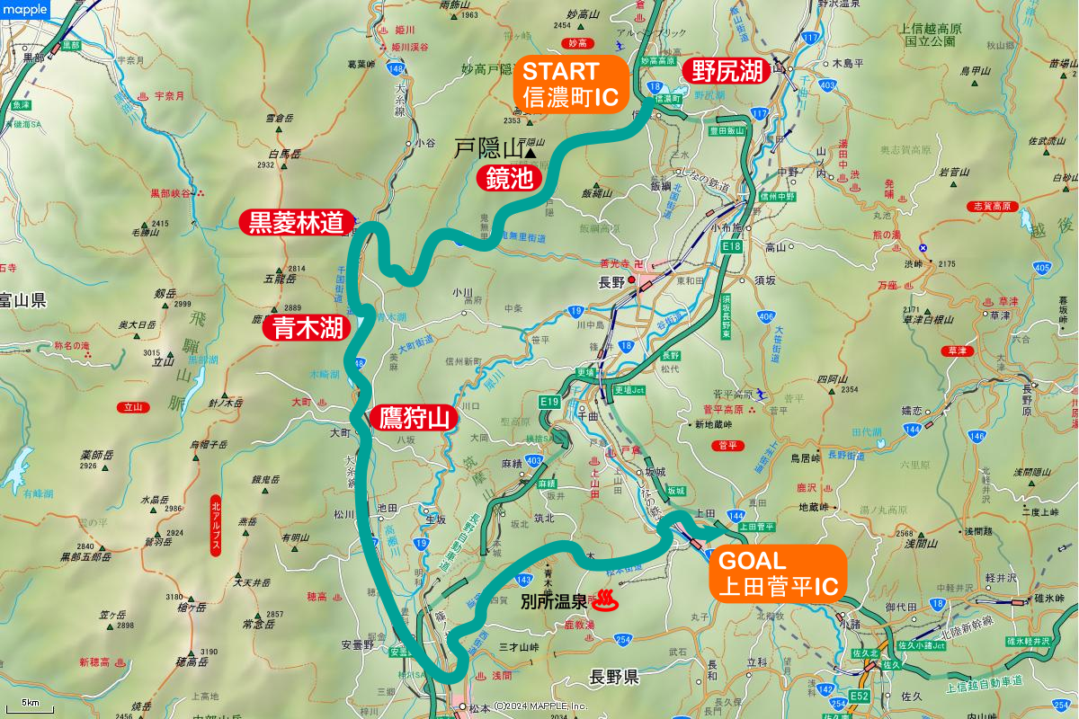長野県の北部を横断しつつ、野尻湖と妙高山、戸隠山、そして北アルプス北端の白馬を結び、白馬から南下して、八ヶ岳へ抜ける。