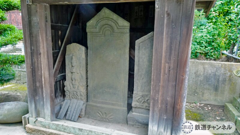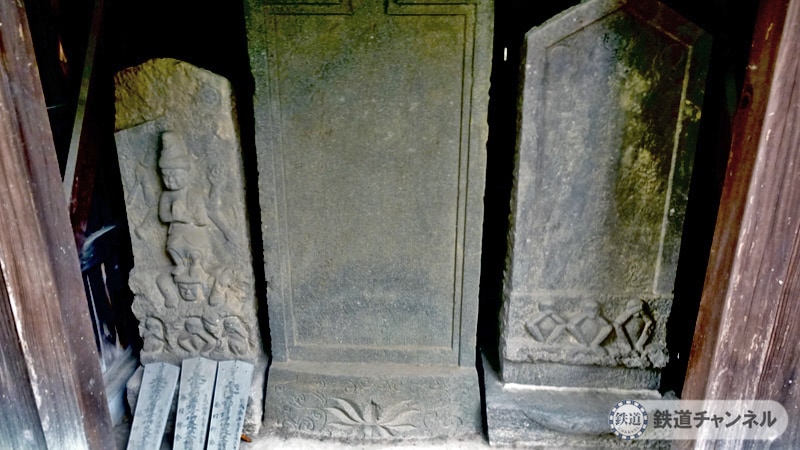 本堂は階段をあがりますが、地面に石碑が覆堂に収められています。