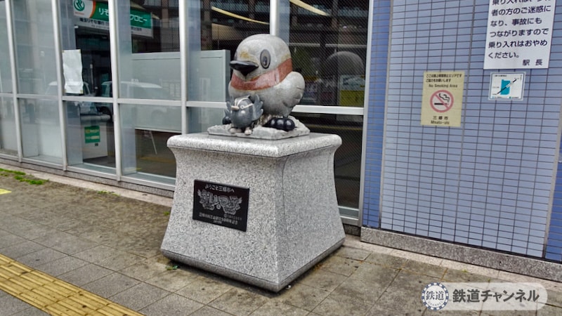 駅出口に「三郷市商工会創立50周年記念 2010年」の「かいちゃん & つぶちゃん」の像があります。市の鳥「カイツブリ(鳰鳥)」をキャラクター化したモノです。どちらが「かいちゃん」でしょう?