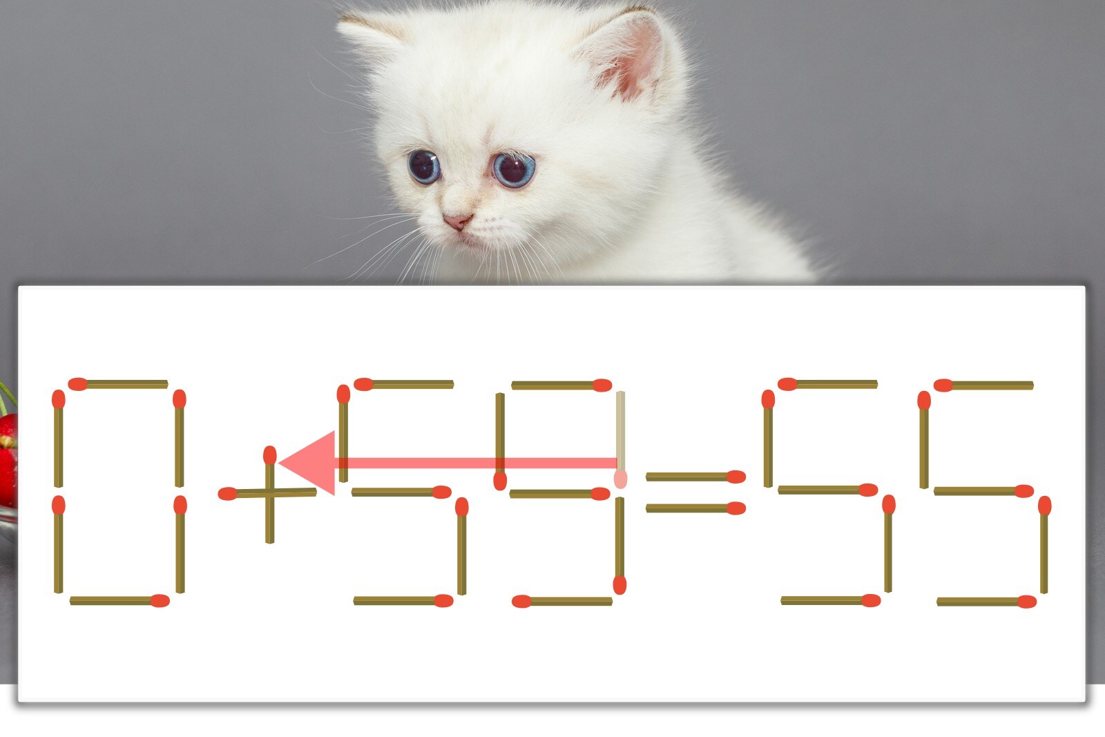 「9」を別の数字に変化させると答えが導き出せます。「9」のマッチ棒を1本移動して、「-」を「+」にしてみましょう。すると、「0+55=55」が成立します。