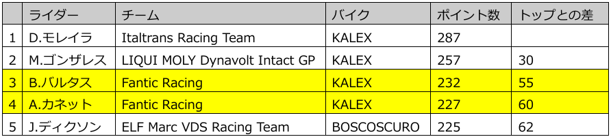 バレンシアで迎えた最終戦は苦い結末となったものの、チャンピオンシップとしては素晴らしい成果に。ファンティック・レーシング加入1年目のバリー=バルタスがランキング3位を獲得し、アロン=カネットはランキング4位でチームに別れを告げた。