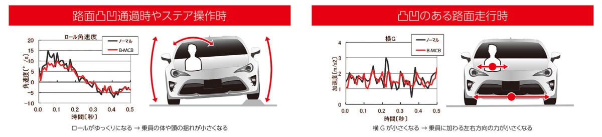 「B-MCB」は、「Motion Control Beam」によるボディ変形の抑制と乗り心地の快適性向上に加え、1台ずつ装着位置や効果の検証を行い、車種毎に専用開発された取り付けブラケット、取付説明書等が付属する車種別専用品です。