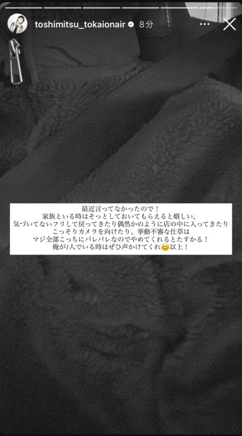 「東海オンエア」(登録者数724万人)の「としみつ」がインスタグラムのストーリーズを更新し、「家族といる時はそっとしておいて」と呼びかけました。