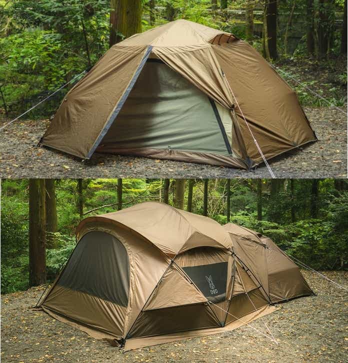 本体だけでも十分使えるシェルターテントですが、寝室用テントやタープなどのオプションを組み合わせることで、2ルームにも3ルームにも進化。スタイルに合わせてレイアウトを自由に広げられるのが特徴です。