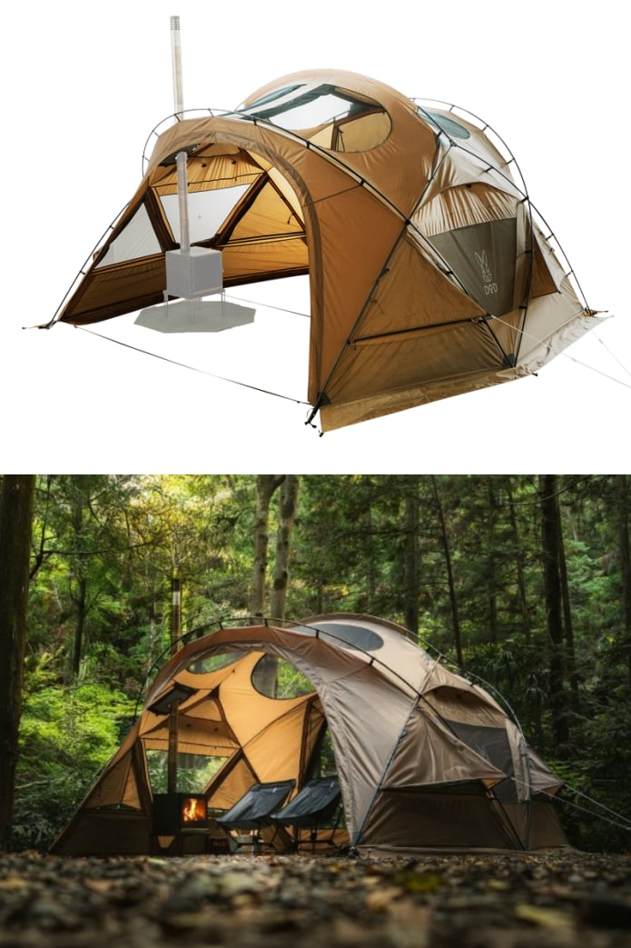 DODのテントとしては初めて、薪ストーブが使える冬仕様と、大きな天窓をはじめとした夏の快適装備を両立した「ガシーンドーム」。