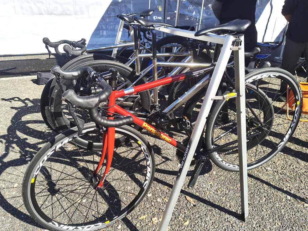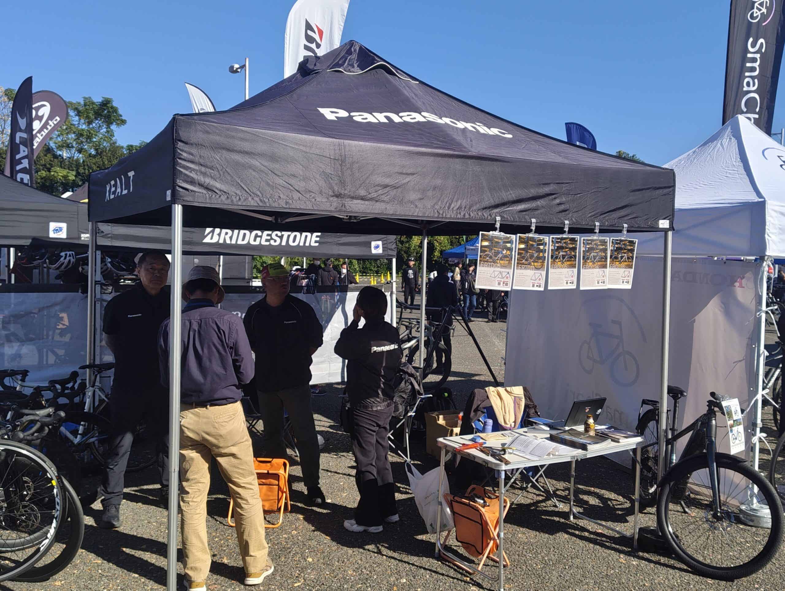 オーダーシステムが魅力のパナソニックブースでは、クロモリとチタンフレームを乗り比べることができます。