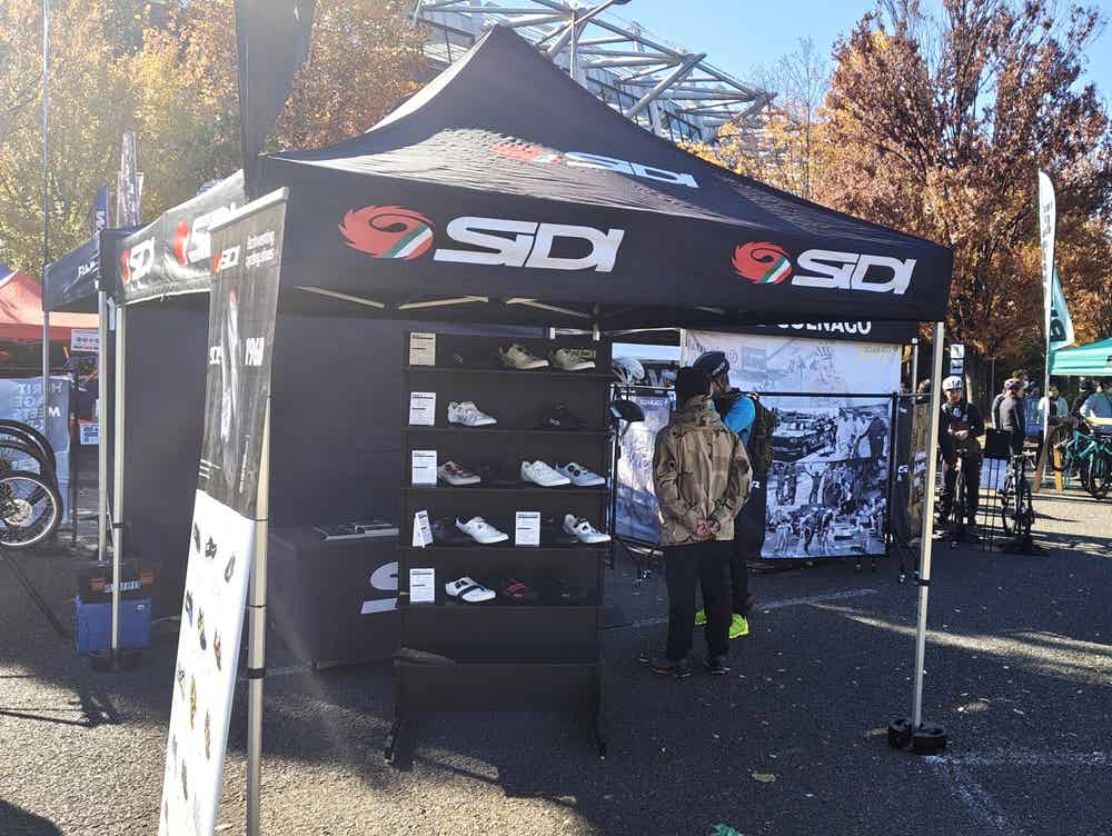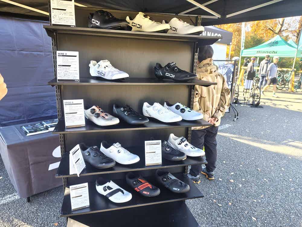 SIDIブースでは、さまざまなビンディングシューズが展示されています。