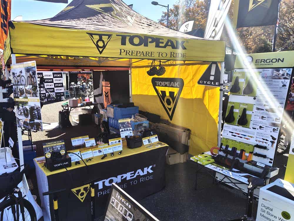 空気入れなどの自転車用品が充実するトピークブースも、スポーツバイク好きならチェックしたいアイテムが多数。