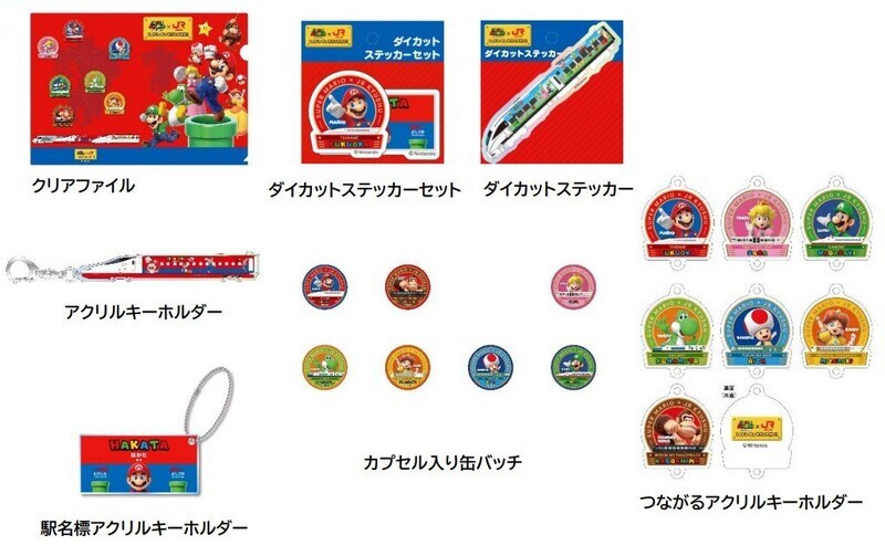 「スーパーマリオ×JR九州」のオリジナルグッズに加え、Nintendo TOKYO/OSAKA/KYOTO/FUKUOKAの公式グッズも販売。ダイカットステッカーやアクリルキーホルダー、クリアファイルなどがラインナップされています。