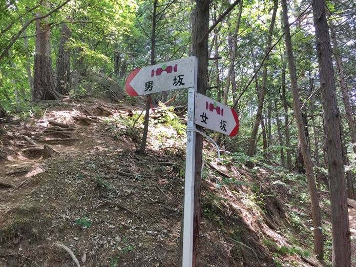 男坂と女坂の分岐。男坂は岩場の急登で、女坂は緩やかな登りです。どちらのコースを歩いても後に合流します。