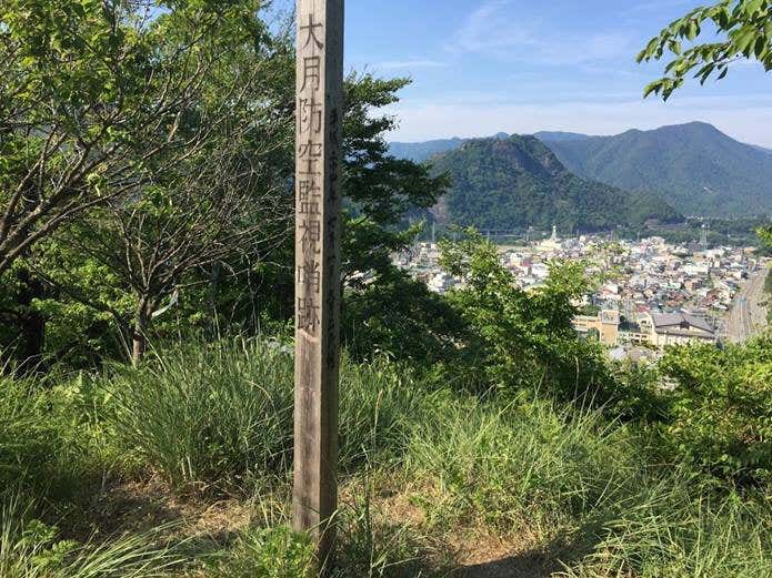 天神峠から約1時間ほど歩くとおむすび山に到着します。おむすび山展望台は、第2次世界大戦中、アメリカ軍の敵機を監視する場所で、今も直径約5m、深さ1.5mの石垣が積まれた聴音壕が残っています。